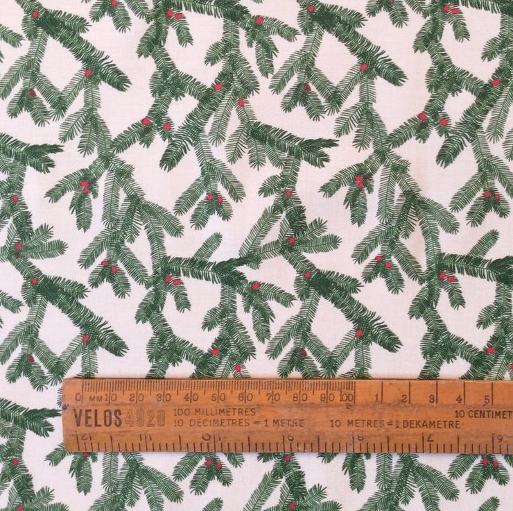 This lovely quality, very light gold coloured fabric features yew leaves and red berries. The second photo is most representative of the colour.