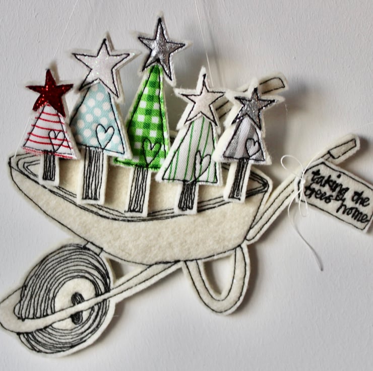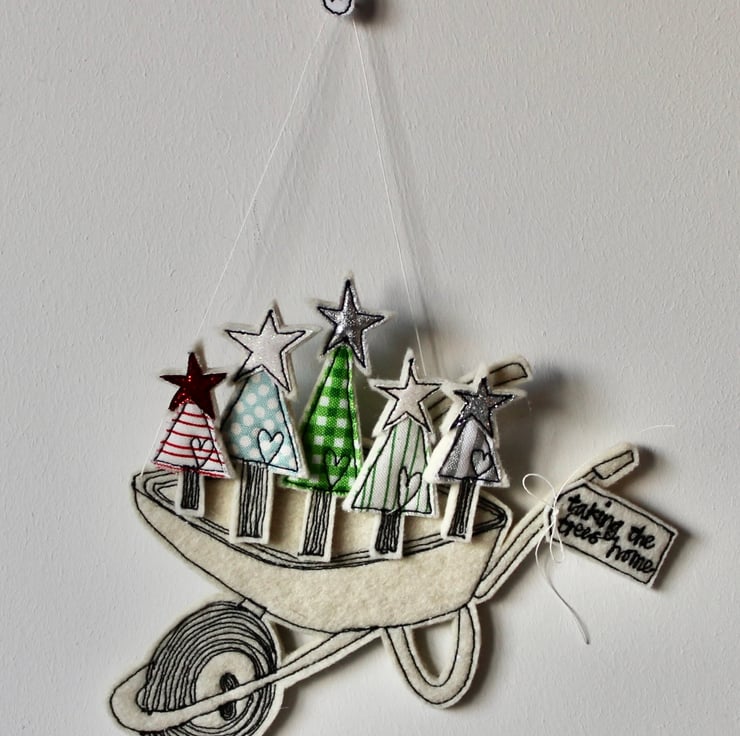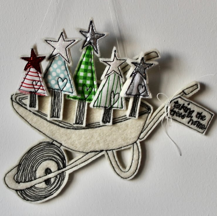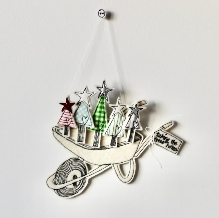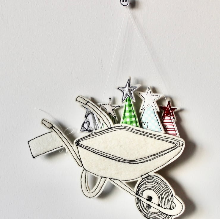 'Taking the tree home' wheelbarrow is sewn using 100% wool felt, cotton cloth, glitter fabric and free hand machine embroidery; multiple layers of cloth are sewn together and cut out by hand using very sharp scissors. With a linen string to suspend.