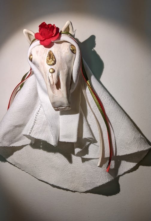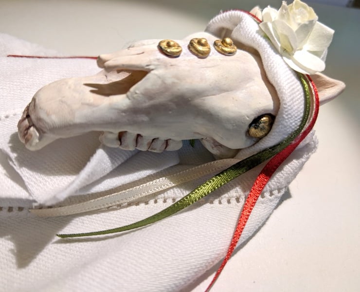 A handmade Mari Lwyd to decorate your tree, a great conversation starter. Based on the ancient South Wales wassailing tradition a visit from the Mari Lwyd is believed to bring good fortune in the following year. Each Mari Lwyd is unique as I hand craft each one from polymer clay, the skulls are around 7-9 cm long and with the cloth the total length is approximately 15 cm.
