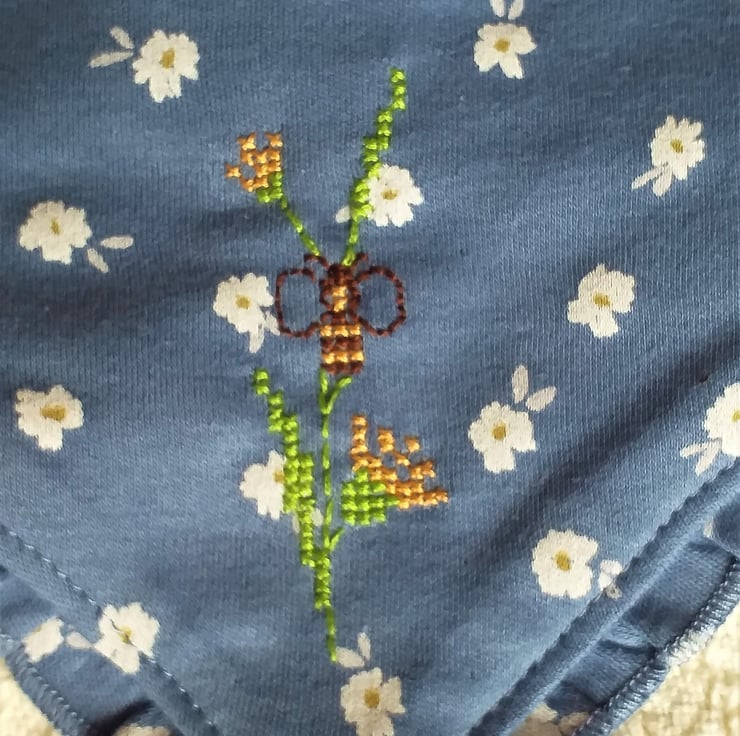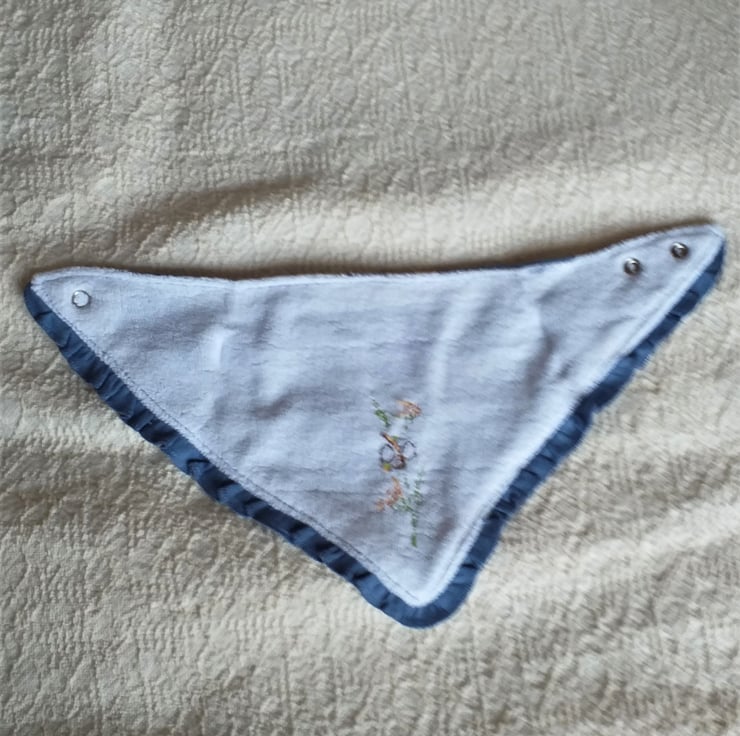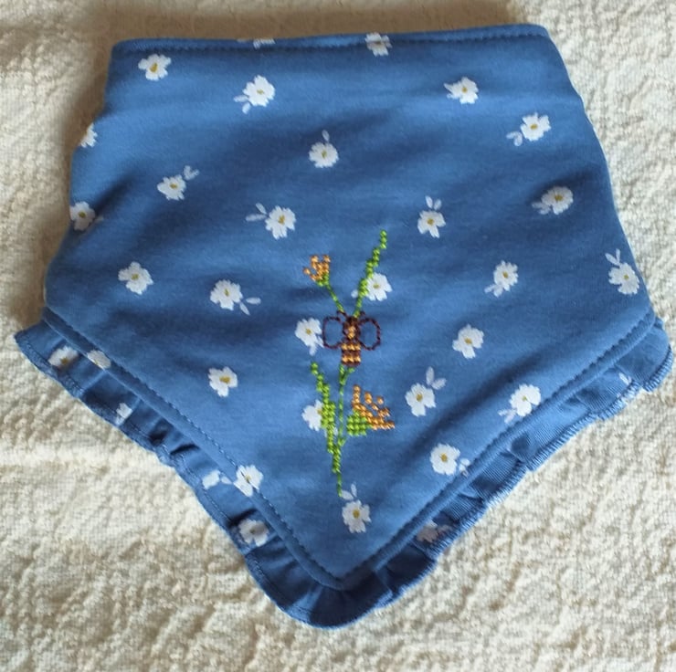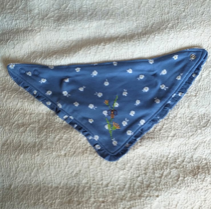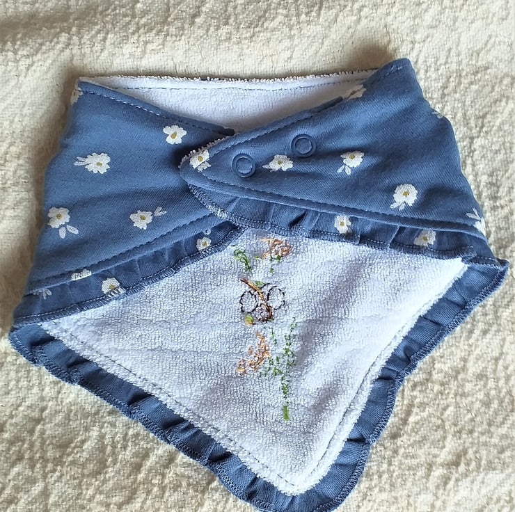 This is one of my favourite bibs. I have hand stitched a bee visiting golden yellow flowers on a background of white daisies printed on air-force blue. The bib is triangular with a short matching frill around around the edge. It fastens with adjustable press-studs at the back of the neck, is cotton on the front, polyester-cotton towelling on the back and can be machine washed.