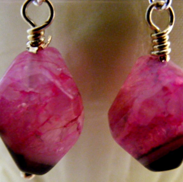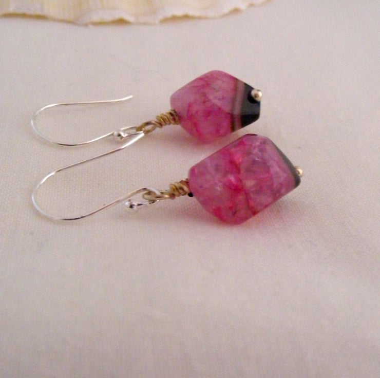 This colourful pair of earrings are made with, 10 x 14 mm fuchsia and black agate with quartz rhombus beads, silver plated headpins and ear wires.
