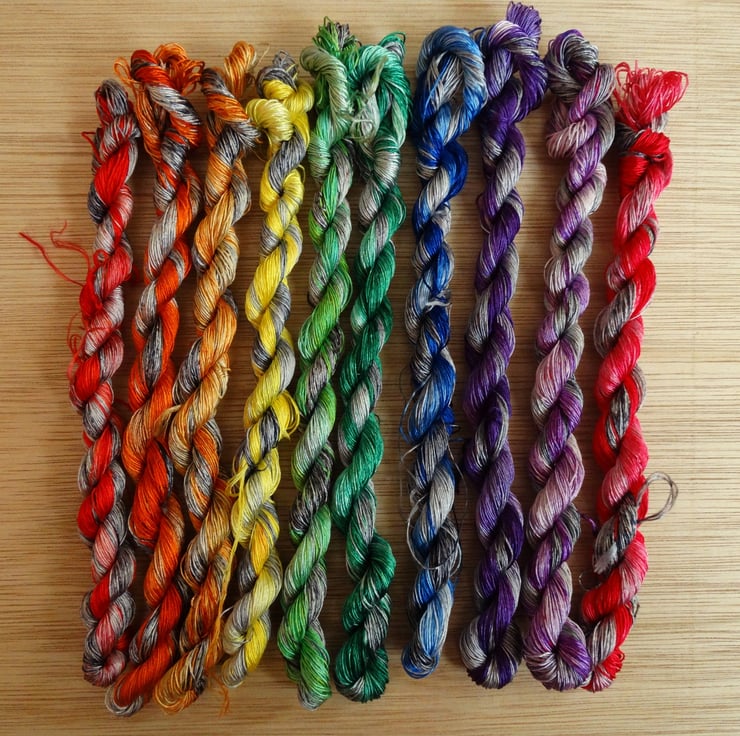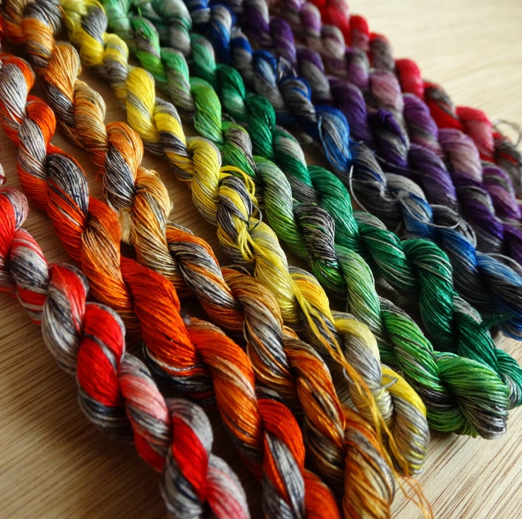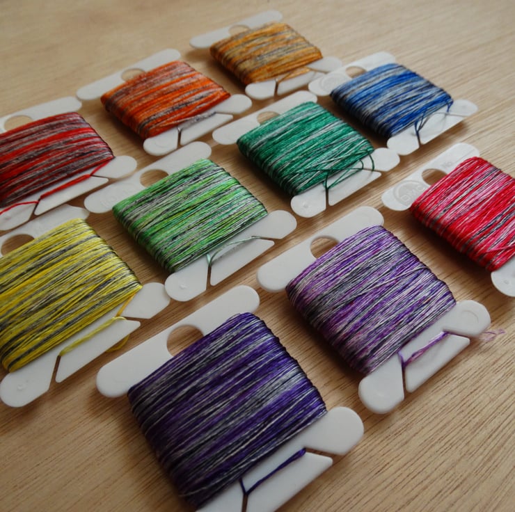 This embroidery thread set is made from of 100% Silk and has been handdyed to create a selection of tonal threads with a grey base. It is perfect for any form of embroidery including cross-stitch, blackwork and free-hand embroidery. It would be particularly perfect for using in a year long stitch along. It will be sent already wound onto a bobbin.