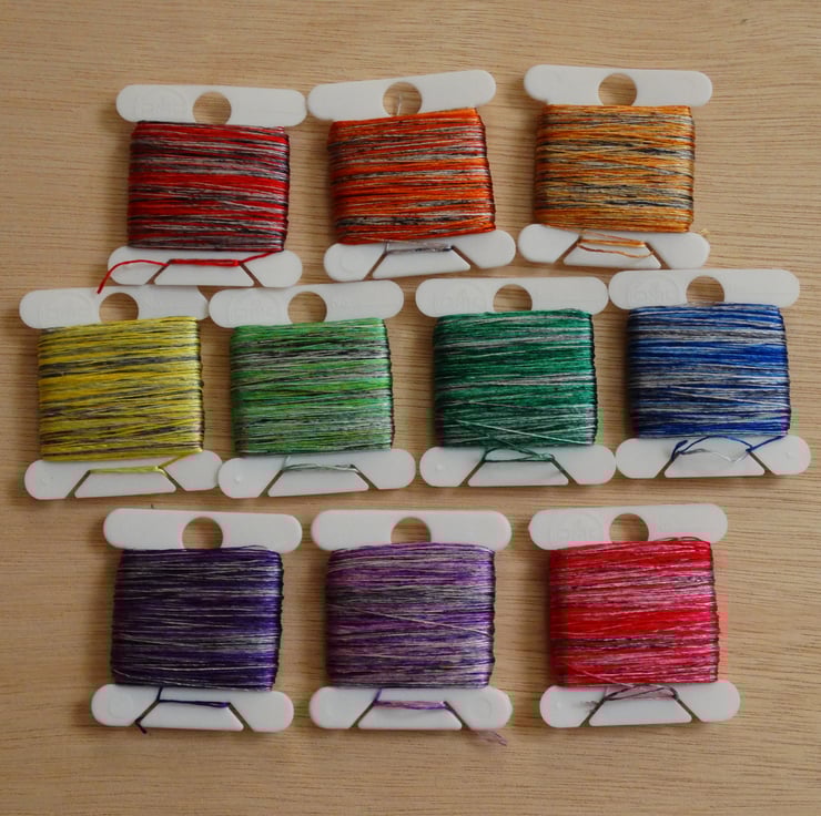 This is a repeatable set of colourways, but exact shades and lengths of repeats will vary between batches - each bobbin will be sent with a label which includes its batch number, there will usually be between 2 and 4 bobbins in a batch.