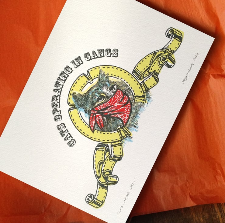 This listing is for a digital wall art "Cats in Gangs" print, inspired by former BBC6 Music presenter Shaun Keaveny's Cart Wall. Lets face it since his departure from his regular radio shows of the past 14 years we've all been needing some additional Cart Wall silliness in our lives. If badges aren't cutting enough positivity to see you through these dark times then treat yourself to a lovely A4 print, hang it in your favourite spot and enjoy feeling like the community garden is still very much thriving!