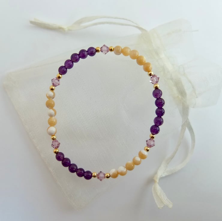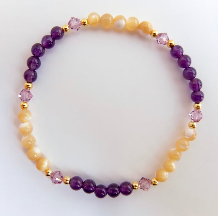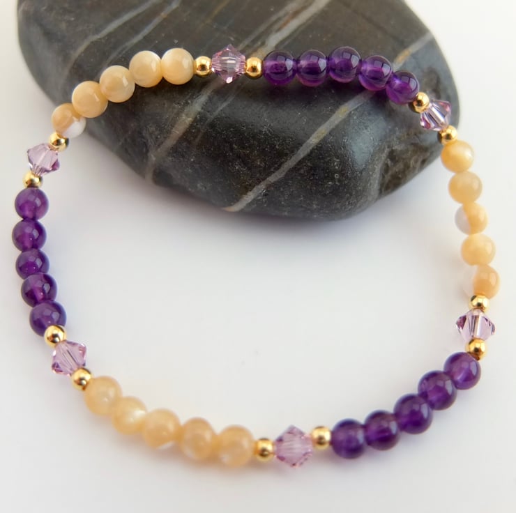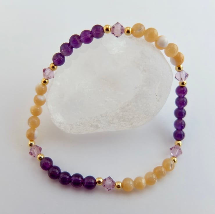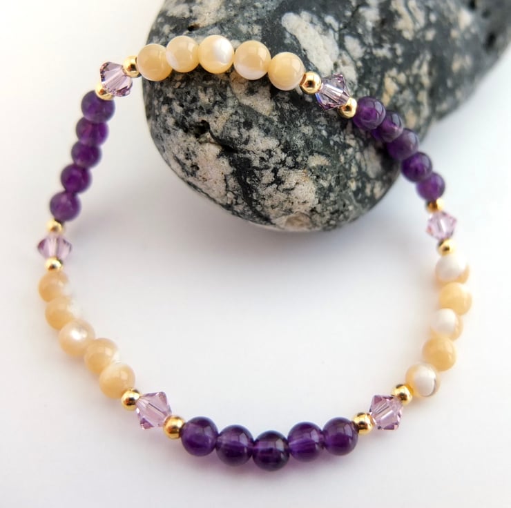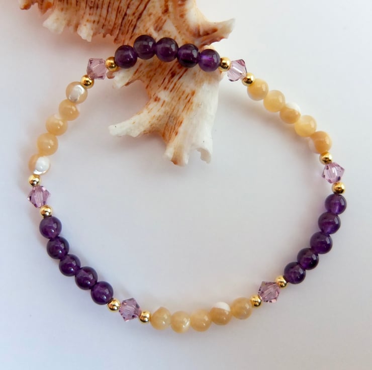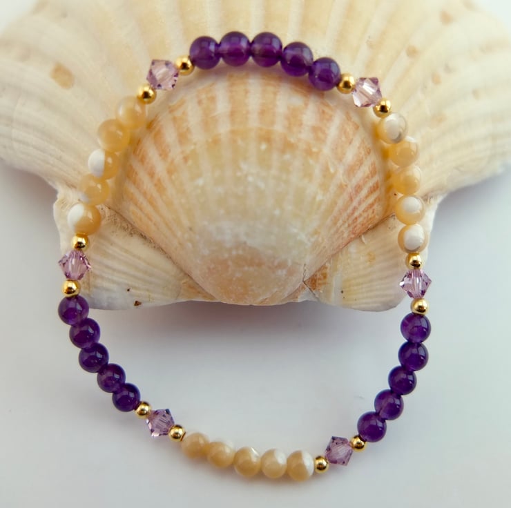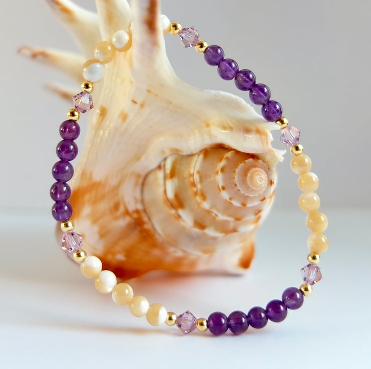 Alternate bands of 4mm amethyst and 4mm mother-of-pearl beads are separated by glittering Swarovski "light amethyst" crystal bicones highlighted with tiny gold vermeil rounds.