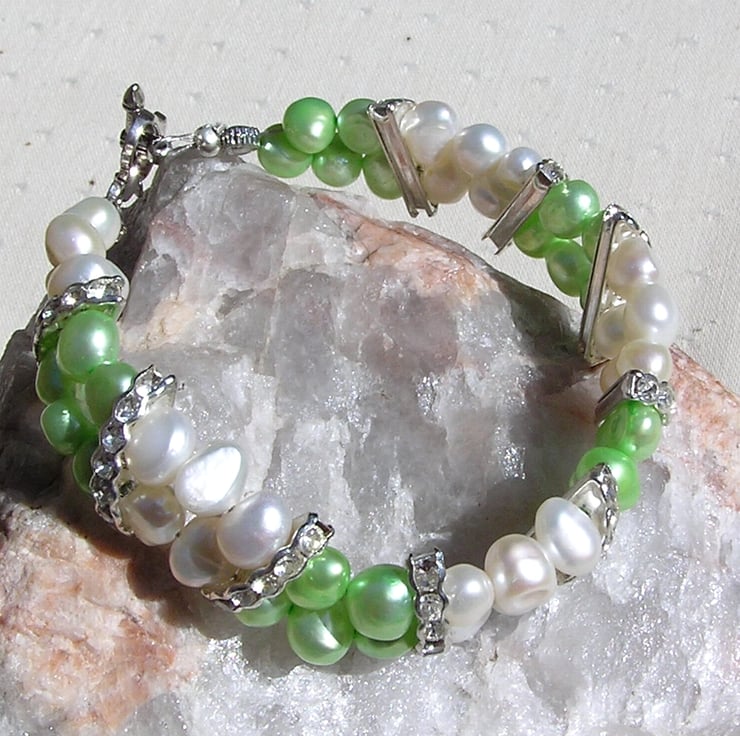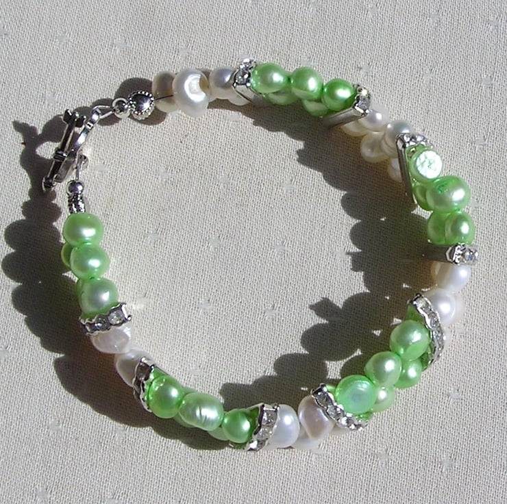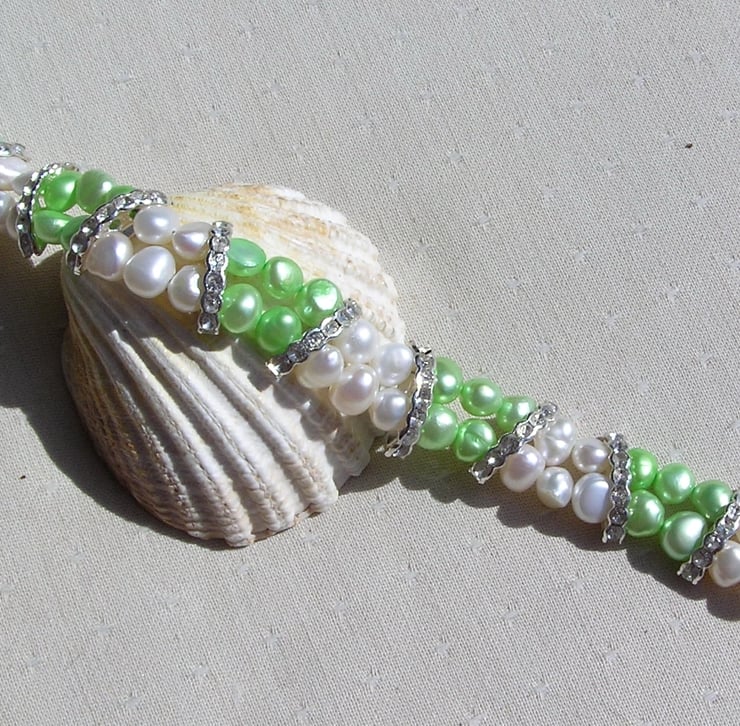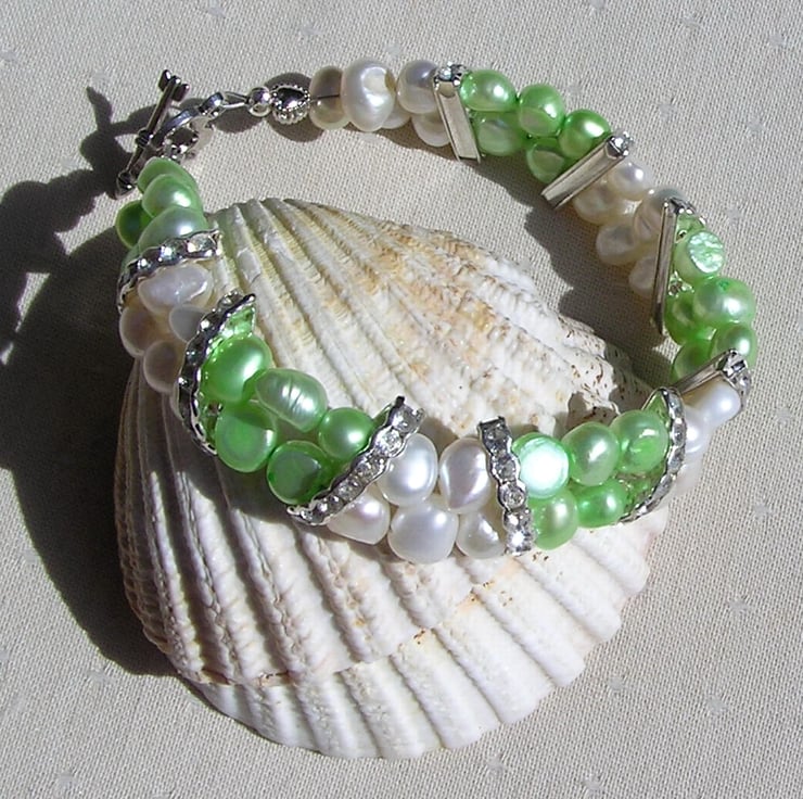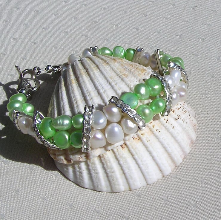 This Stunning Bracelet is made from Beautiful Freshwater Pearls… Apple Green & White, grouped together in Fives separated by a spacer bar studded with Glistening Crystals positioned at an angle - A Beautiful Combination that will look stunning for either the casual look or wear it with something more Elegant for a Special Evening out