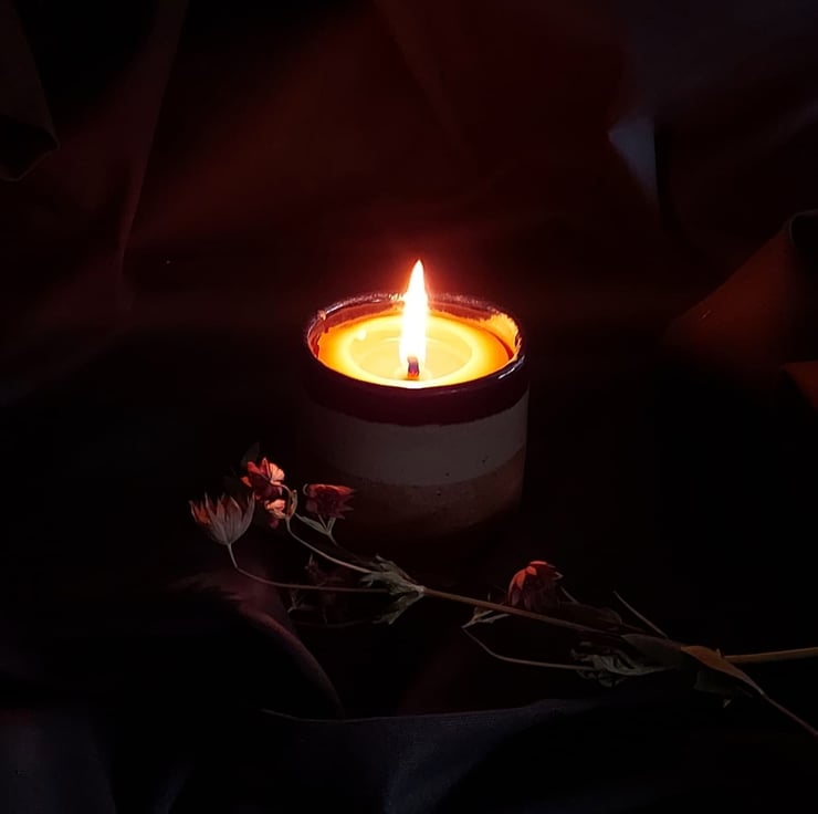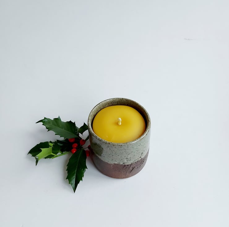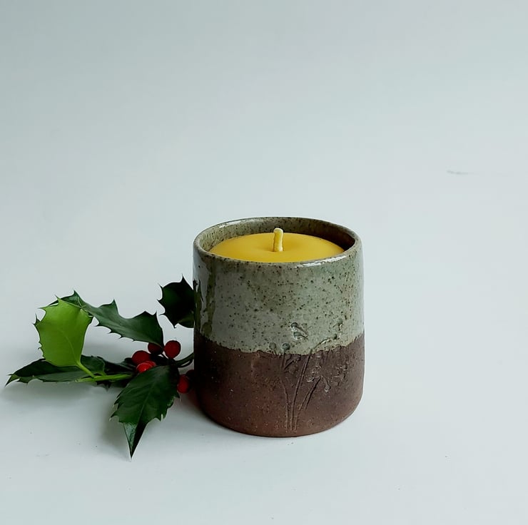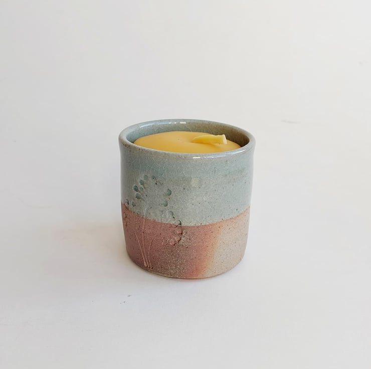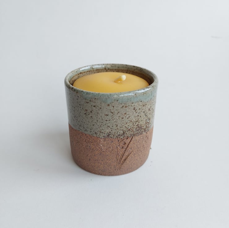 This glaze has a celadon green glaze. It crackles giving a wonderful effect. The tumbler is filled with a hand poured beeswax candle. This will give about 40 hours of burn time. Once the candle is finished you can either put another candle in it or a small plant.