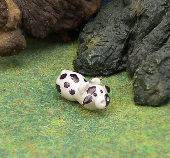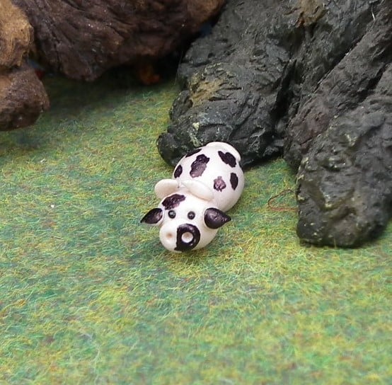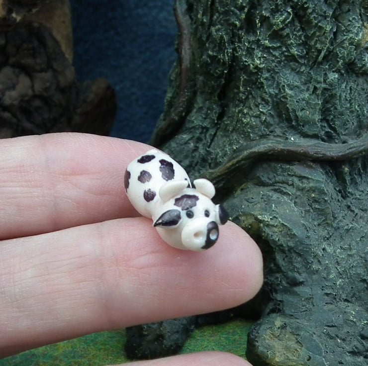 This is a 'one of a kind' creation having been entirely handmade without the use of moulds here at my studio on the Sussex Coast. Modelled with my own blend of polymers before sealing with lacquer, this cow has sparkling black eyes. The tiny cow is one inch from nose to tail.