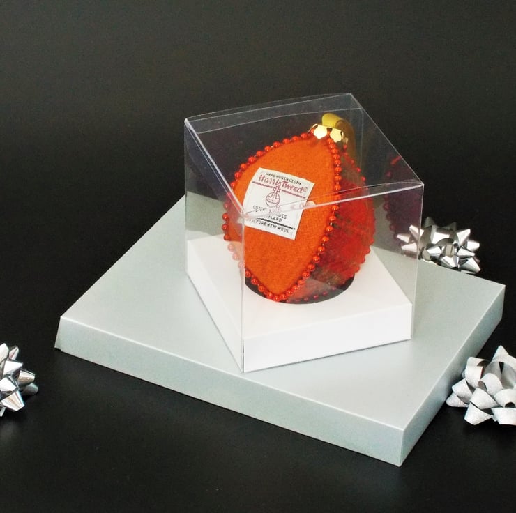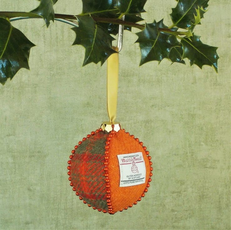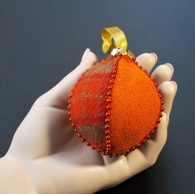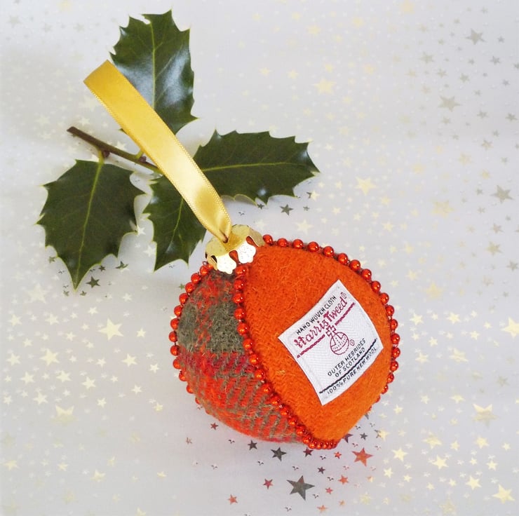 Luxury heirloom Christmas tree decoration handmade from Harris tweed hand-woven fabric in orange tartan. It is approx. 7.5cm in diameter and comes complete with a gold satin ribbon hanging loop. The "Orb" label, your guarantee of genuine Harris tweed is proudly displayed.