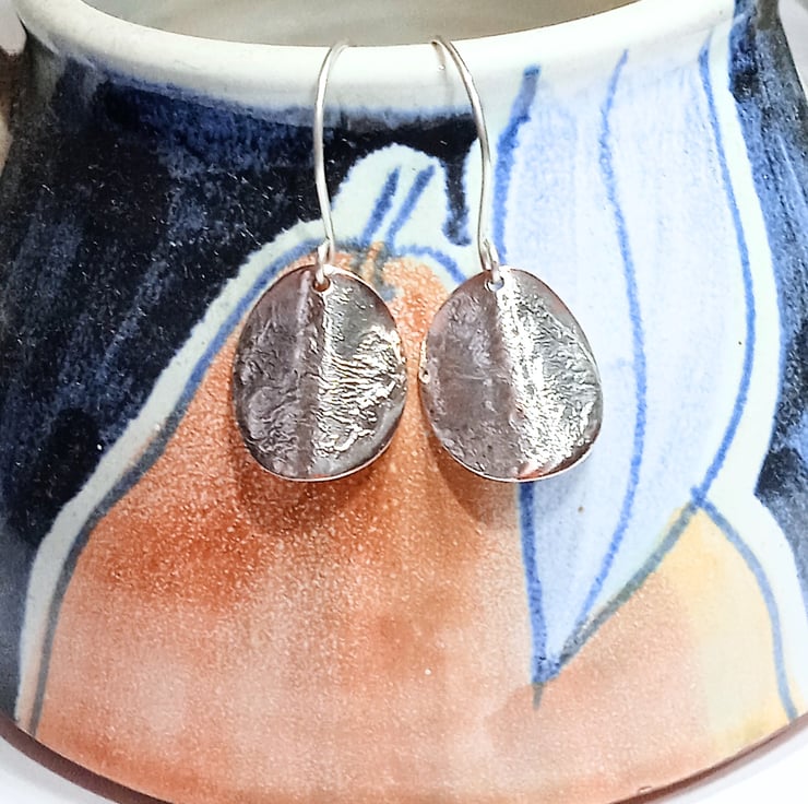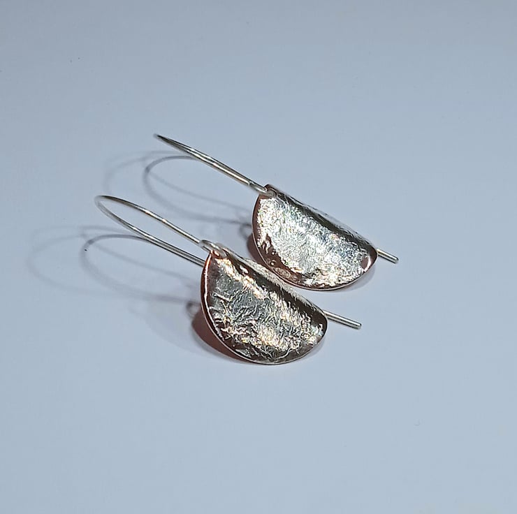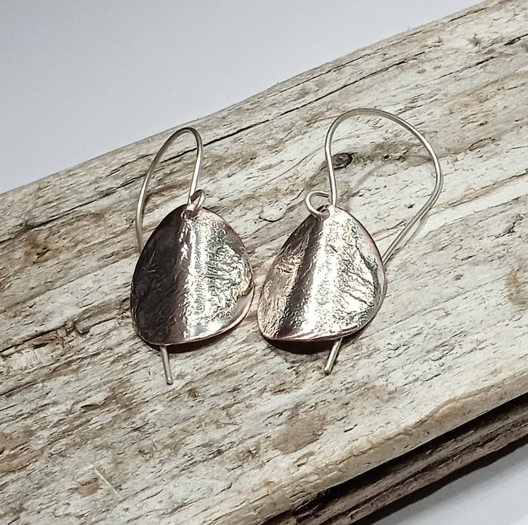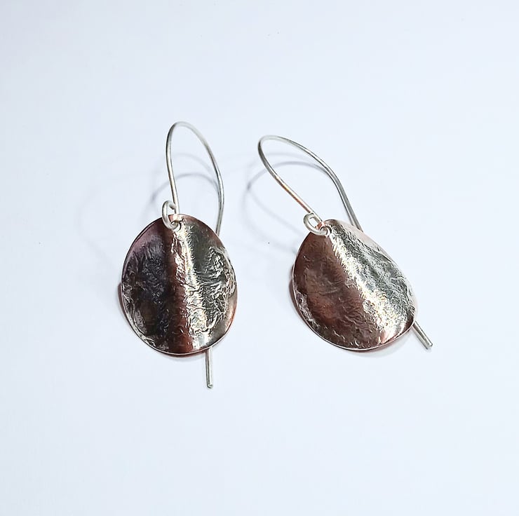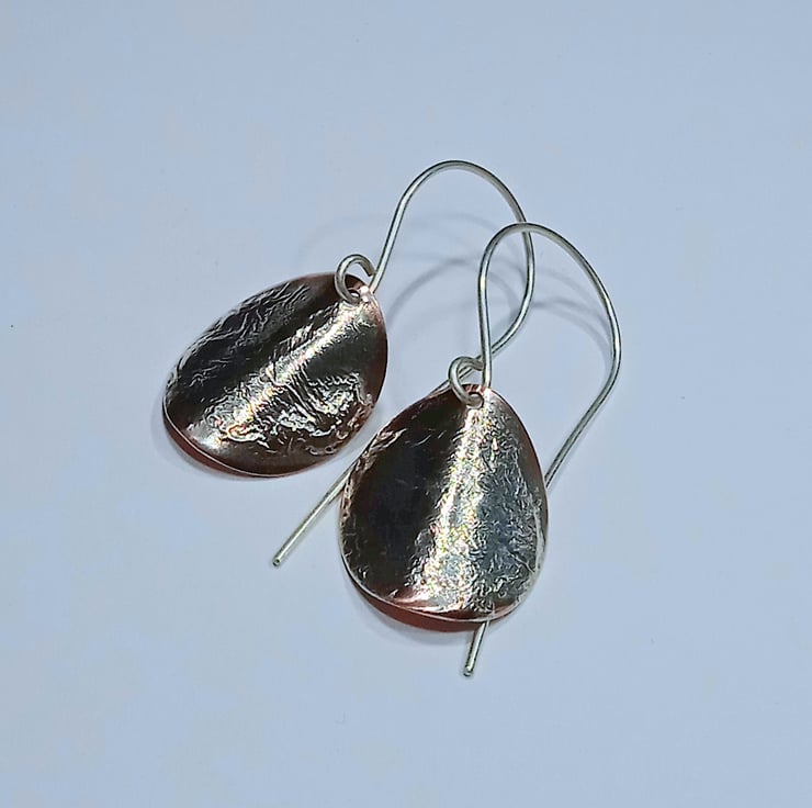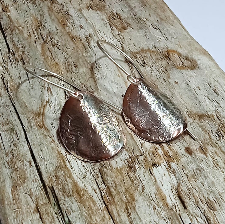 These beautiful earrings combine copper and sterling silver. I have coated the majority of the surface area on the fronts with sterling silver. This creates an interesting irregular, one of a kind, 'reticulated' style finish,