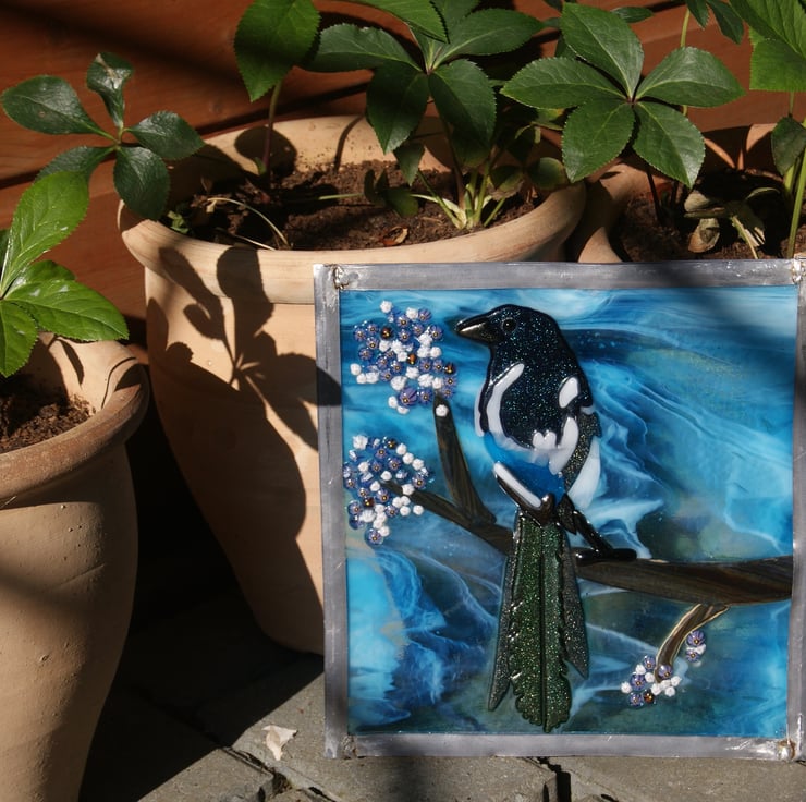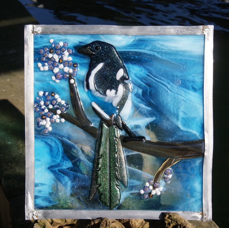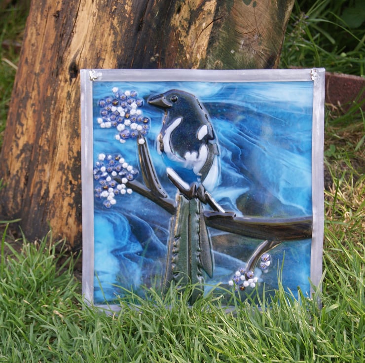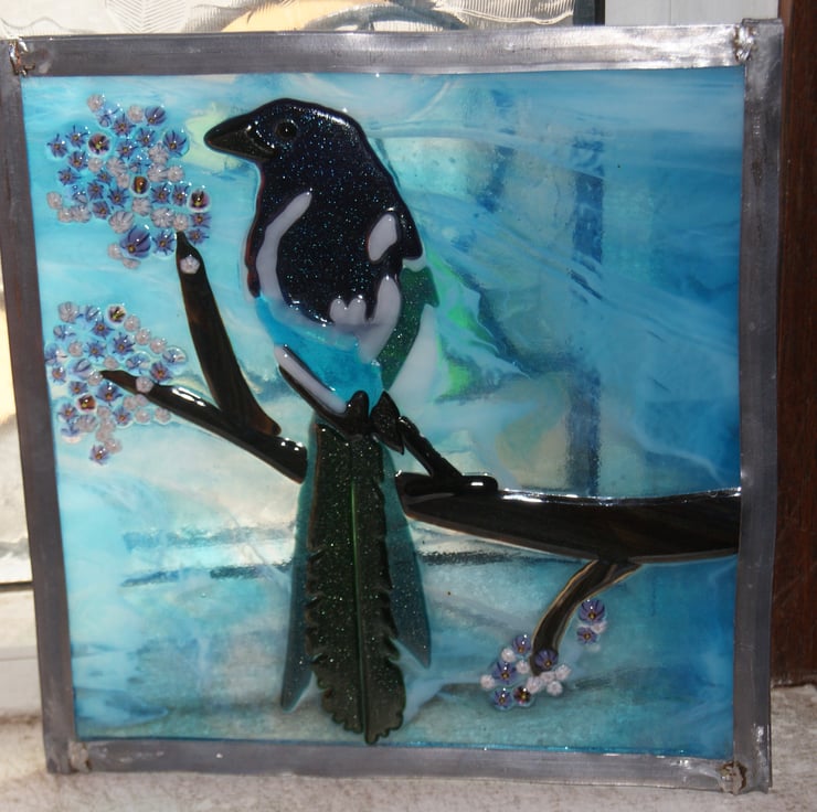 A one off piece of artwork, this stunning Magpie sitting in a cherry tree glistens in the sunlight. Made using a contour fuse for a 3D effect every piece of this picture has been cut to size by myself, various iridescent colours have been capped in clear glass for a deep extra sparkle to his plumage.