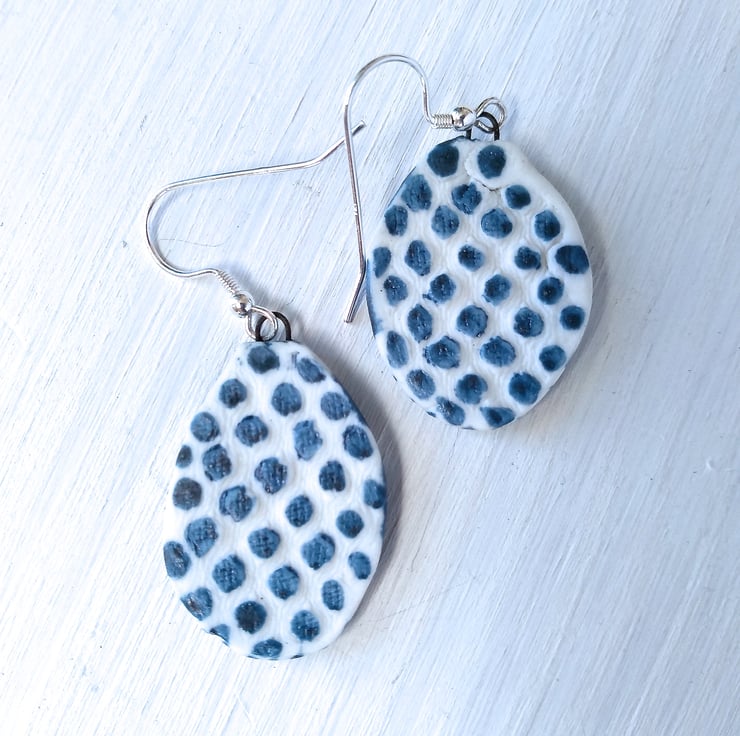These cobalt blue and white porcelain drop earrings are hung on sterling silver hooks. Hand made and painted by Linda in her studio in Winchester they are delightfully light to wear. Unglazed, they have a crisp matt finish with a spotty design on the reverse.