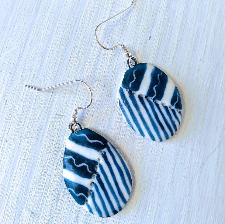 My obsession with cobalt blue against a crisp white background has been a constant inspiration gained from my childhood eating every meal off blue and white Willow Pattern plates. These drop earrings are designed to be light and comfortable to wear and hang beautifully. They look fantastic with grey hair too !