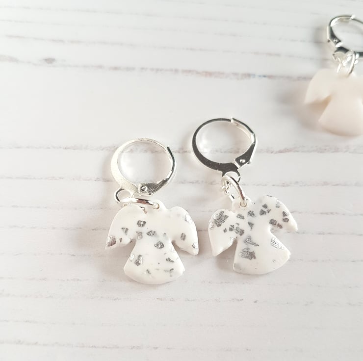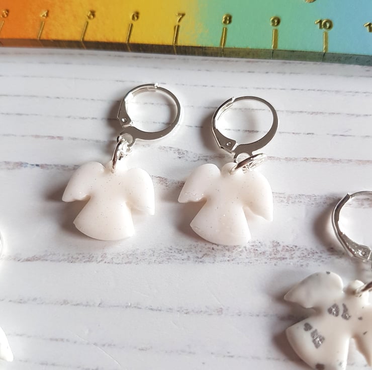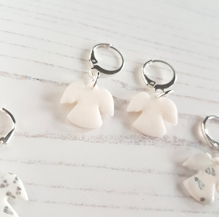 A selection of beautiful polymer clay earrings in the shape of Angels!! All made in white polymer clay, sanded for a smooth finish, choose from one pair of white glitter Angels, or two pairs of white with silver leaf Angels!
