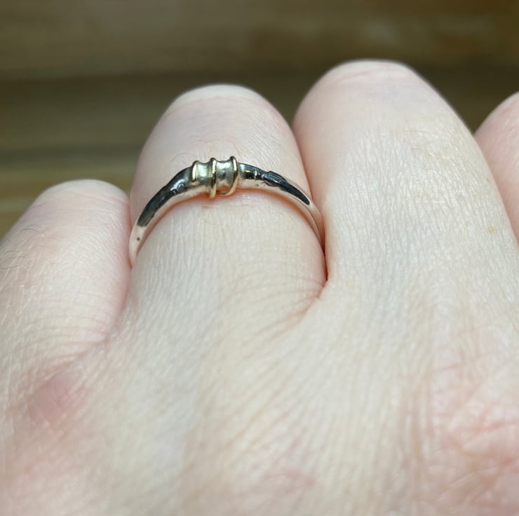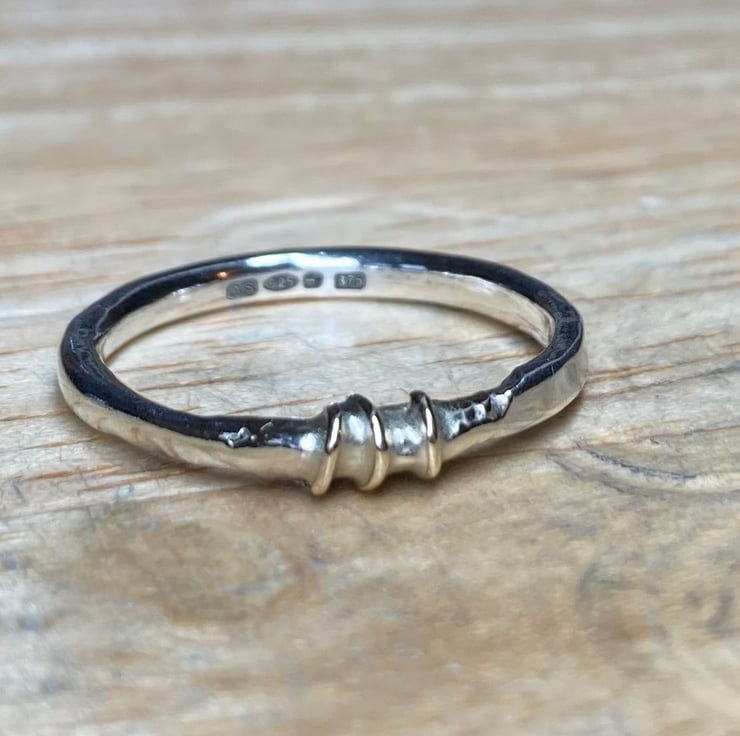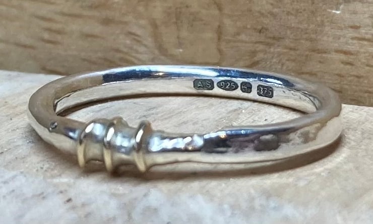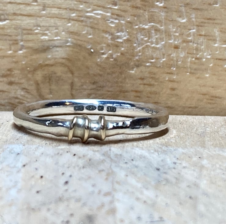 Handmade Sterling silver band with melted 9ct gold and 9ct gold wire wrap, uniquely beautiful! Has been Halkmarked at the Assay Office for authenticity of the precious metals. UK Ring size L-M (this does not stand for Large - med) for an easy way measure your ring size please see pictures.