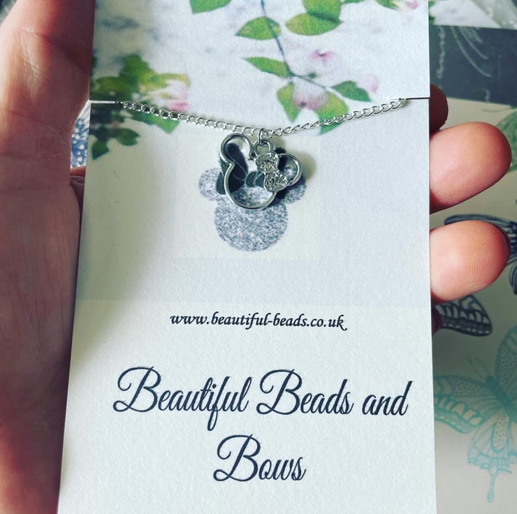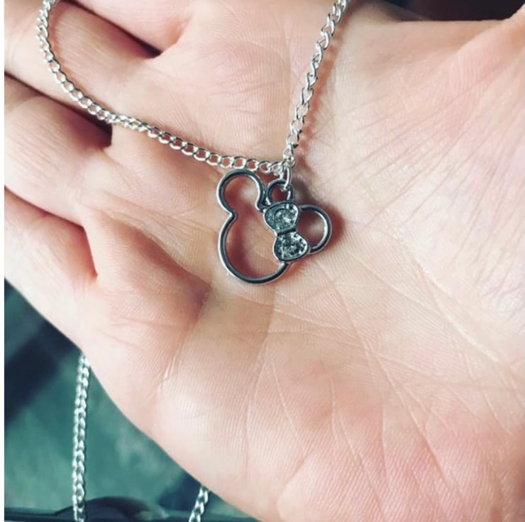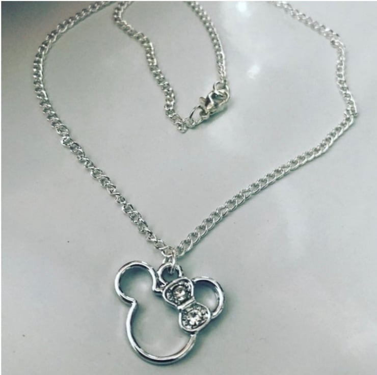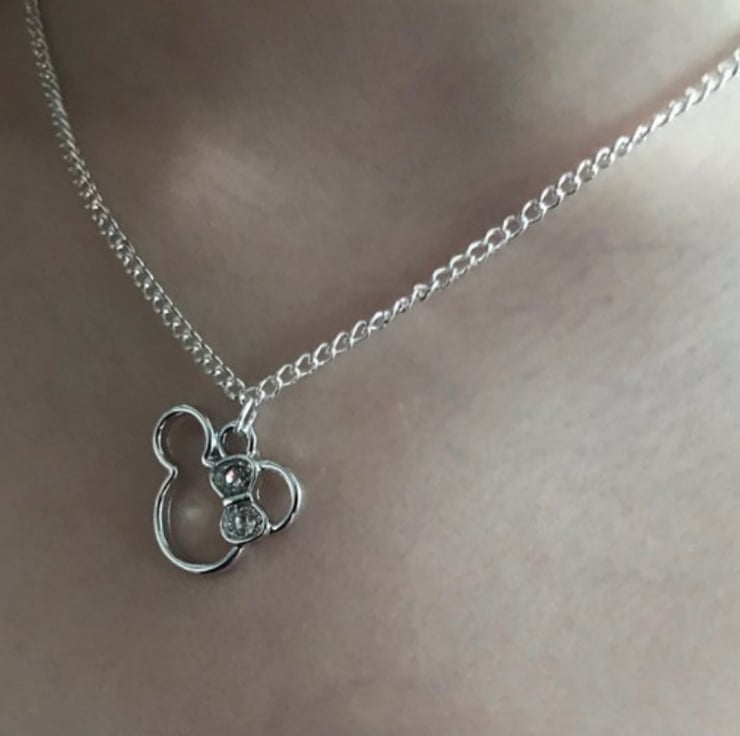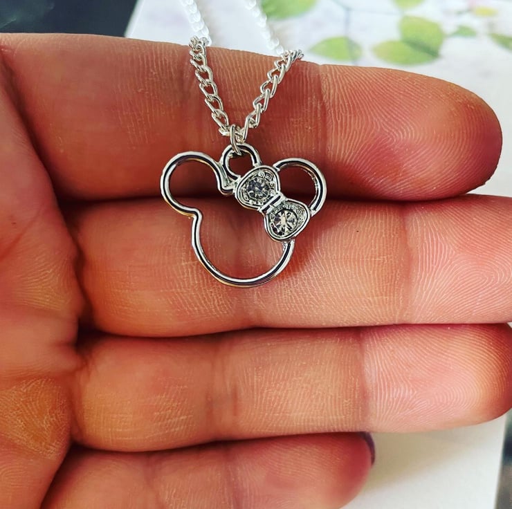 16 inches Silvertone chain necklace with lobster clasp and rhinestone Minnie mouse pendant