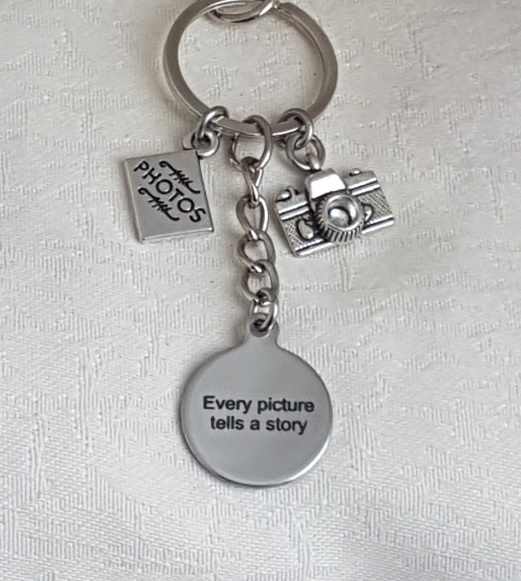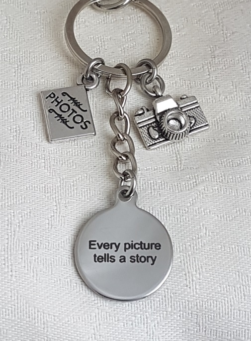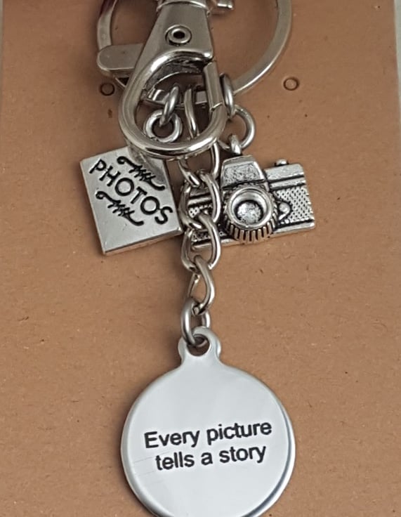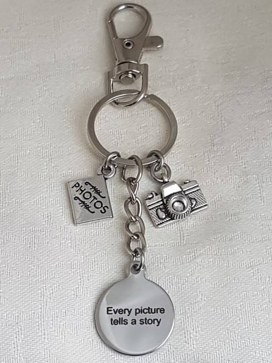 Item length is approx 11cm long. Steel tag is approx 20mm in diameter, is laser engraved with the slogan Every Picture Tells a Story. Camera charm and photos charm are Tibetan Silver. Has swivel clasp and split ring.