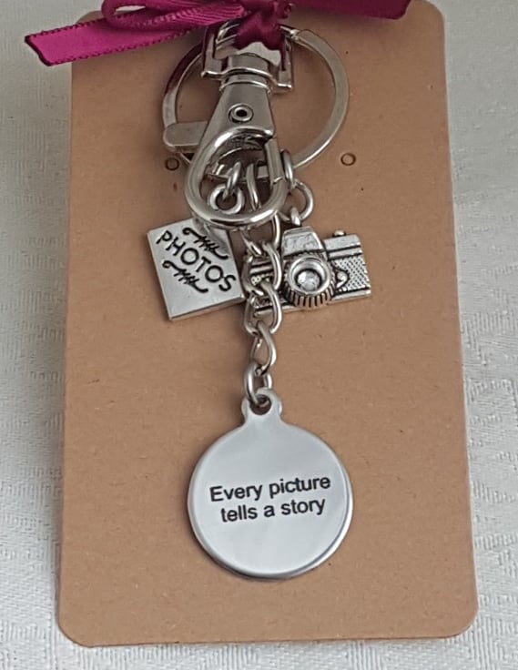 The small laser engraved tag says Every picture tells a story and is accompanied by a camera charm and a tag that says photos.