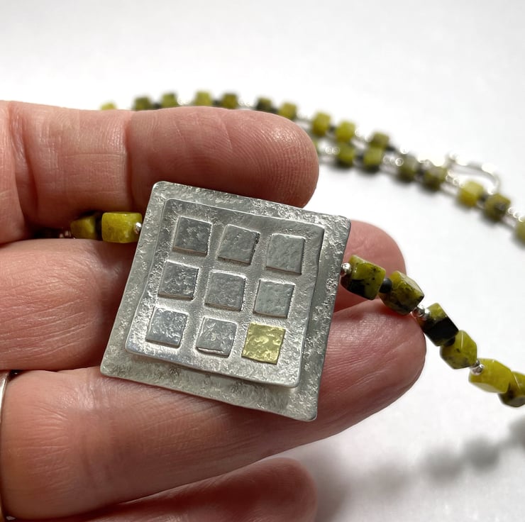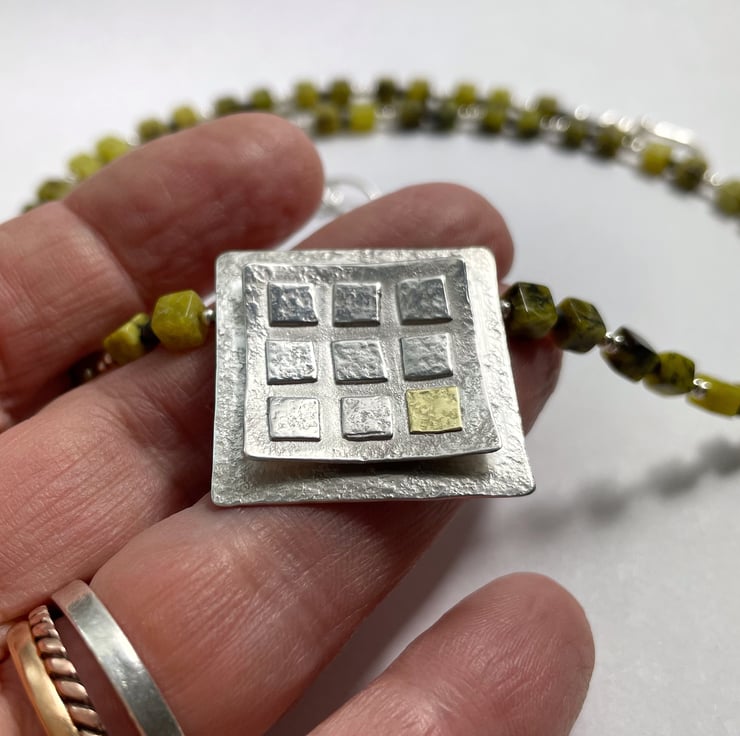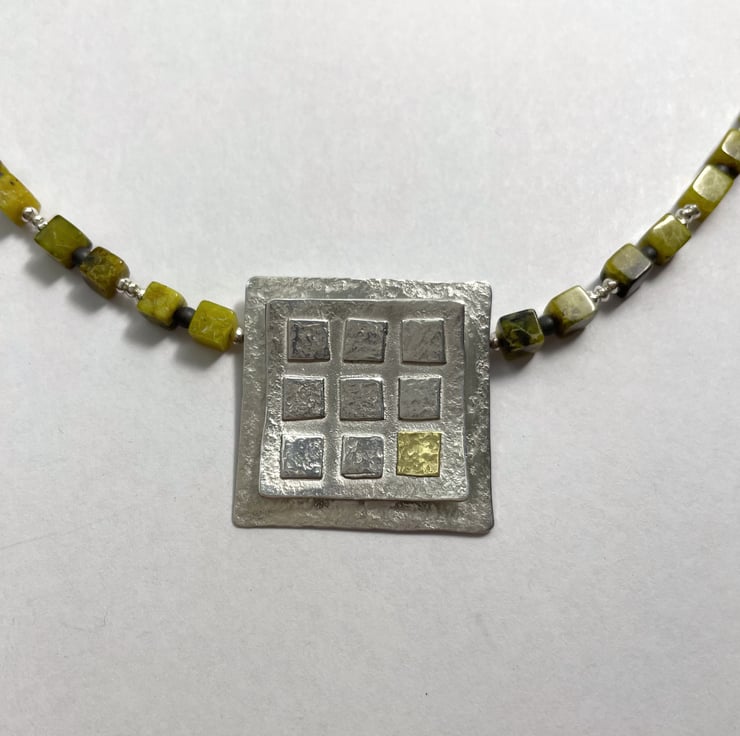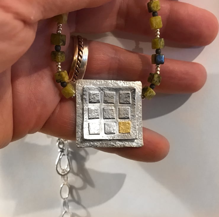 I have made the pendant by fusing a grid of 8 silver squares and 1 18ct gold one to a larger square . This has been dished and soldered to an even larger square.