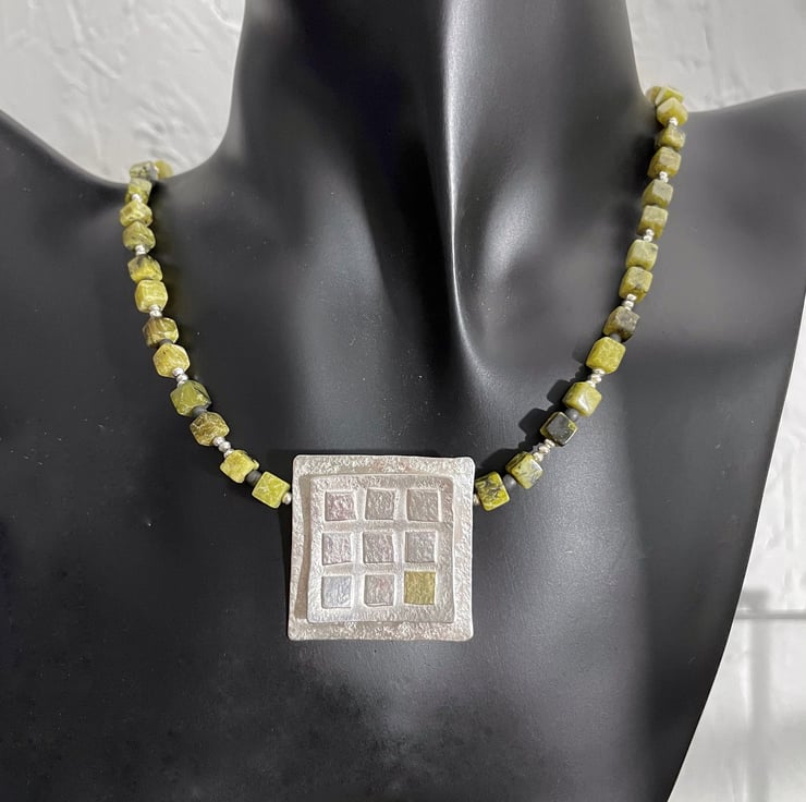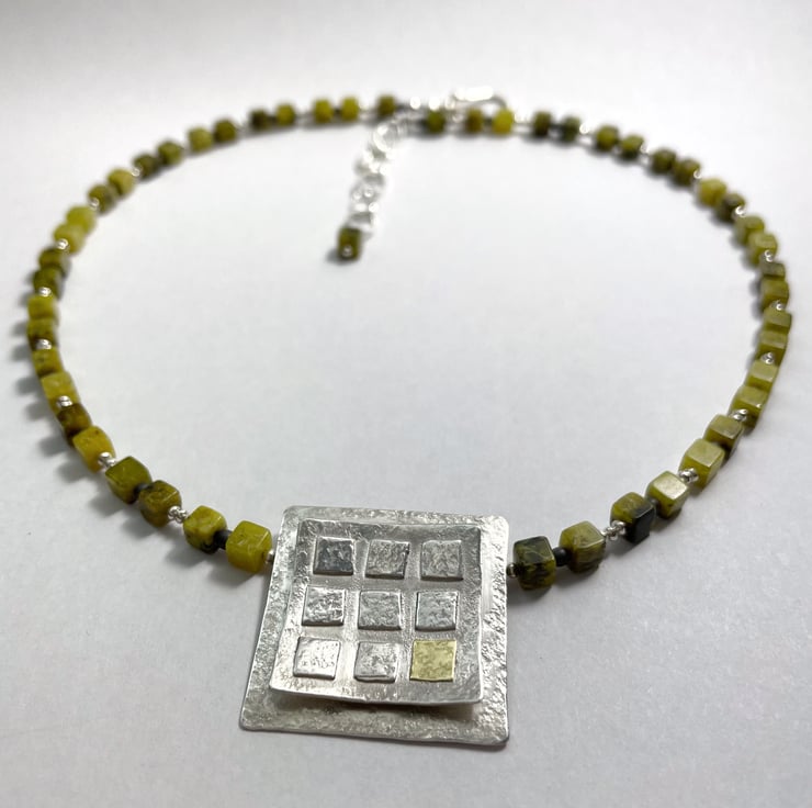 Sterling silver 18ct gold and olive Jasper geometric necklace