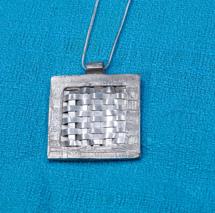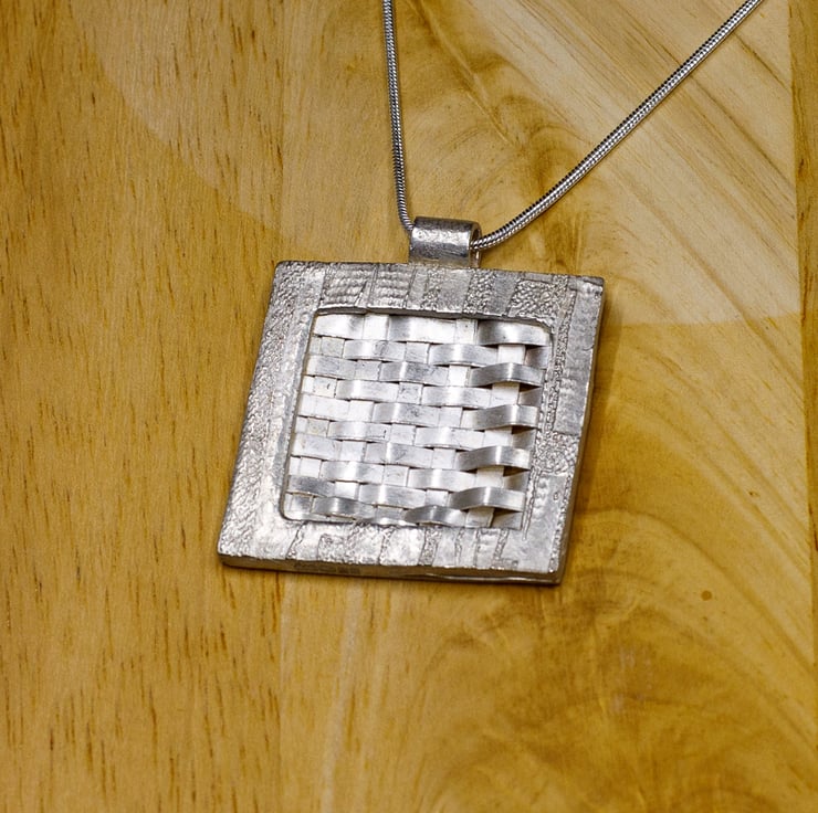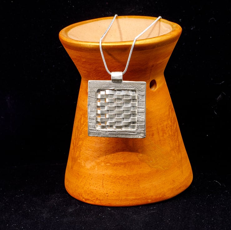 This pendant was made using silver clay. It is a woven design encased in a silver frame. It is 3.5cm square has a 18in/45cm sterling silver chain. it is hallmarked at the Sheffield Assay Office.