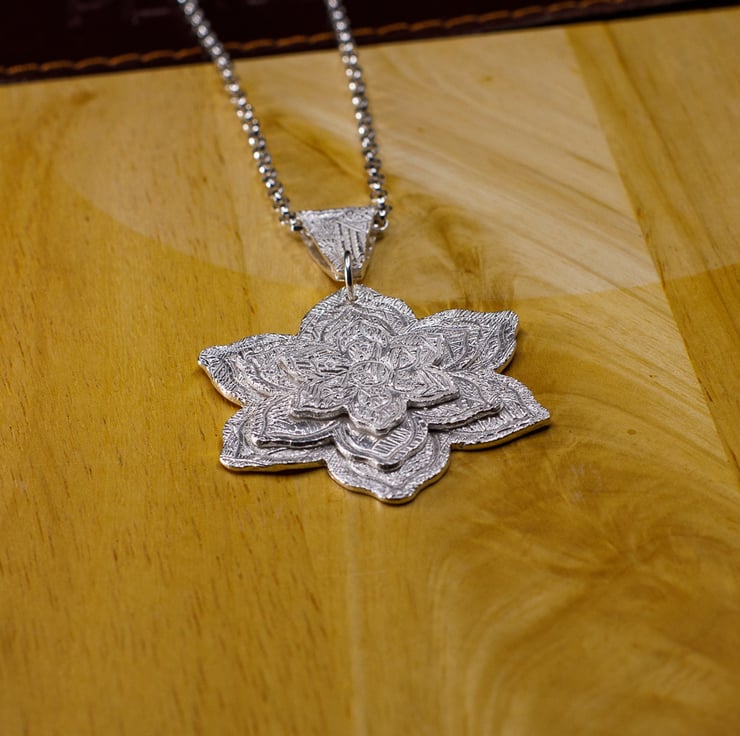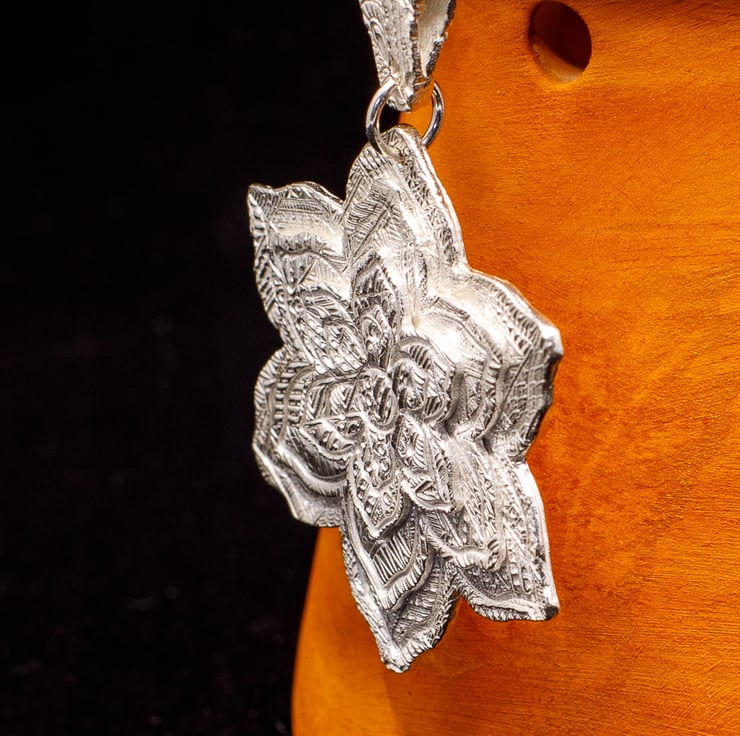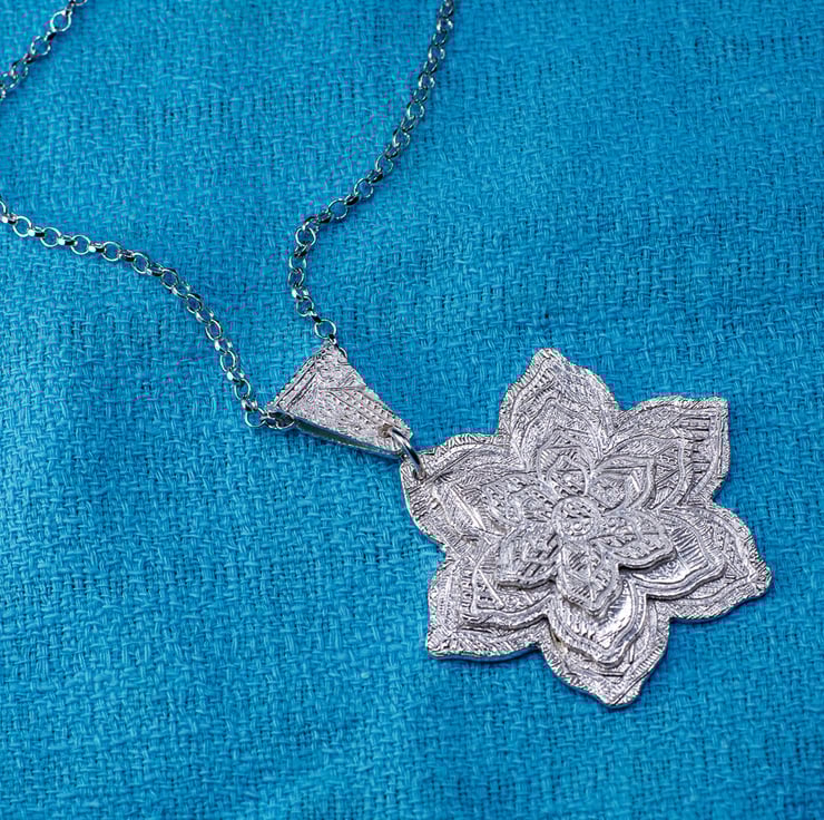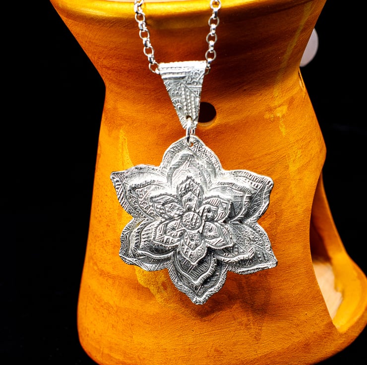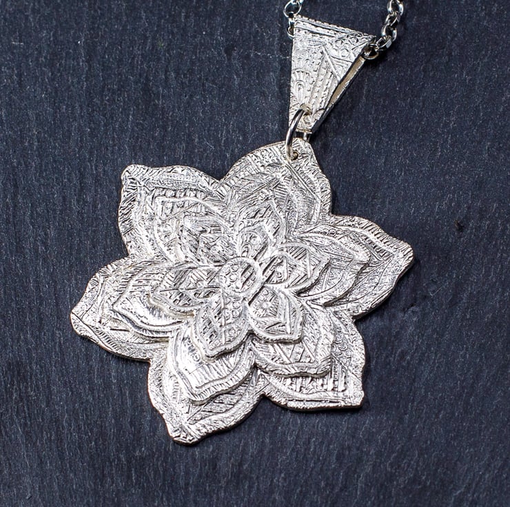This large triple layered textured flower pendant was made using the silver clay technique. It measures 4.5 cm at it widest point, tip of a petal to the tip of the opposite petal and hangs on a 18in/45cm sterling silver chain.