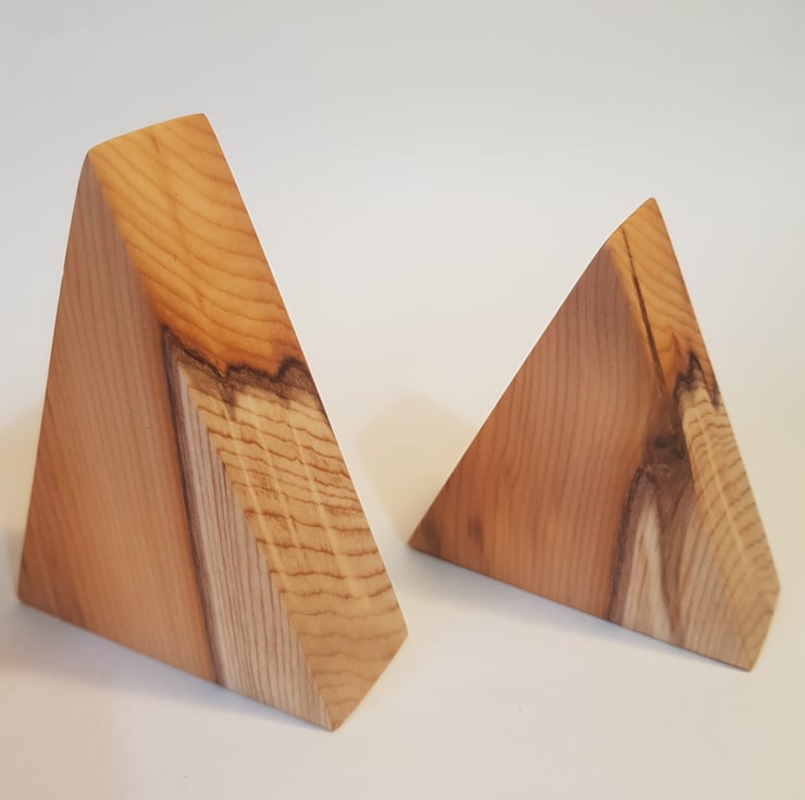 Trio of Yew Christmas tree decorations, 110mm, 95mm, 75mm x 25mm. A lovely piece of timber cut to show off the Yews incredible colours and grain pattern, they would make a lovely addition for Christmas.