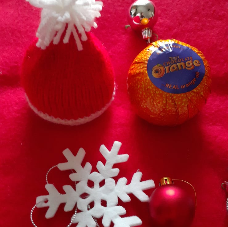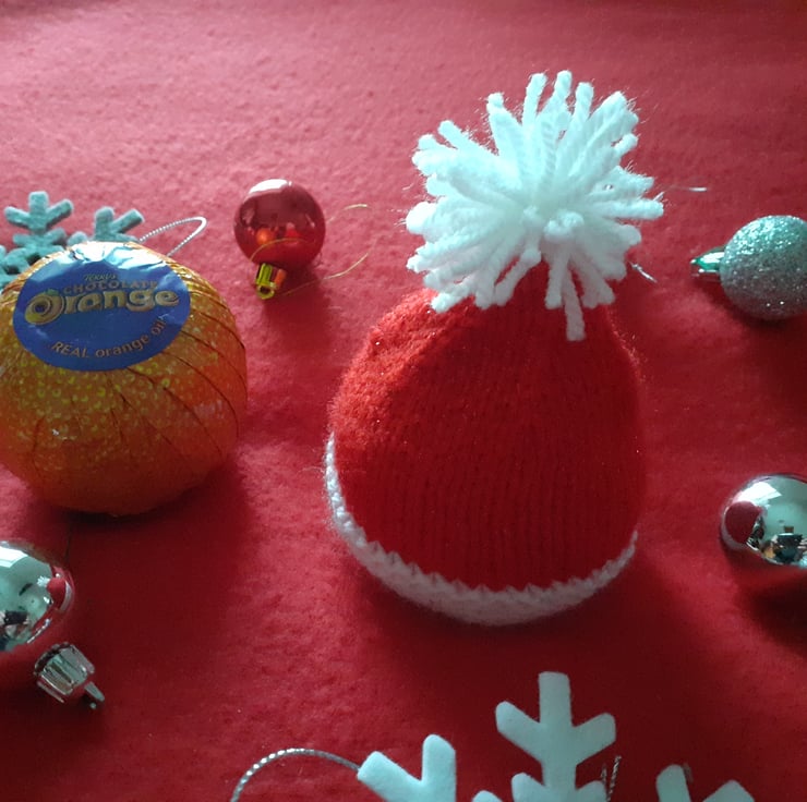 A hand knitted SANTA HAT terry's chocolate orange cover.