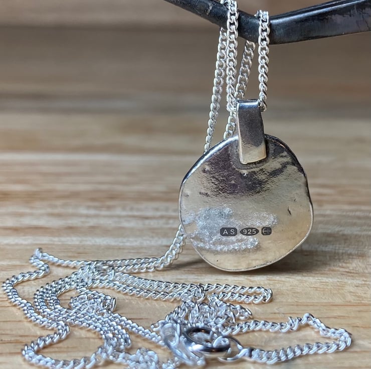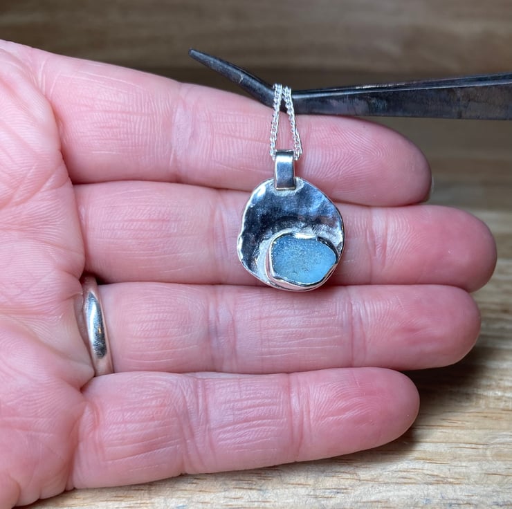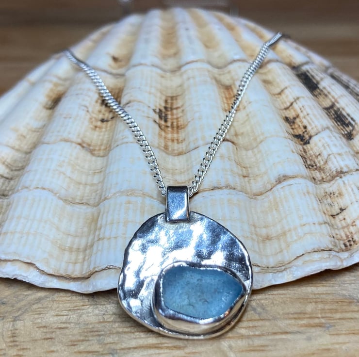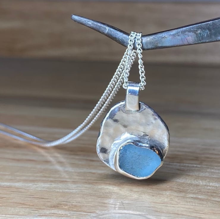 Stunningly unique handmade solid Sterling silver textured pendant which features a beautiful piece of ice blue coloured welsh sea glass collected from a North Wales beach. This piece has been officially hallmarked at the Assay Office for authenticity of the precious metal. The pendant hangs on a 20’’ length 1.5mm thick Sterling silver curb chain. Longer or shorter chains available upon request, please leave a note on ordering.