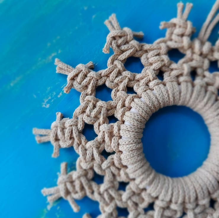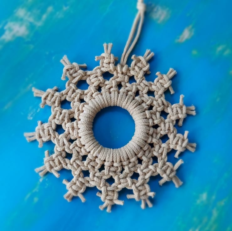 This lovely macrame snowflake has a wonderful boho, rustic vibe. Perfect to hang on your tree or on your wall.