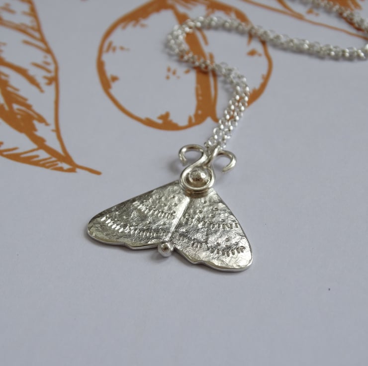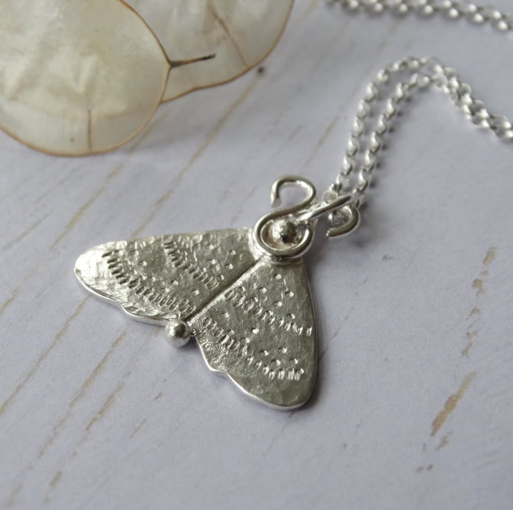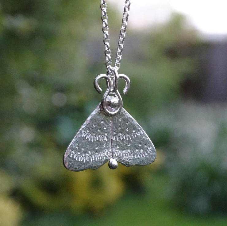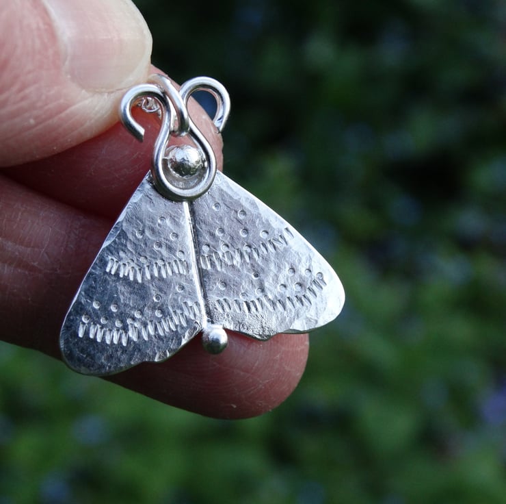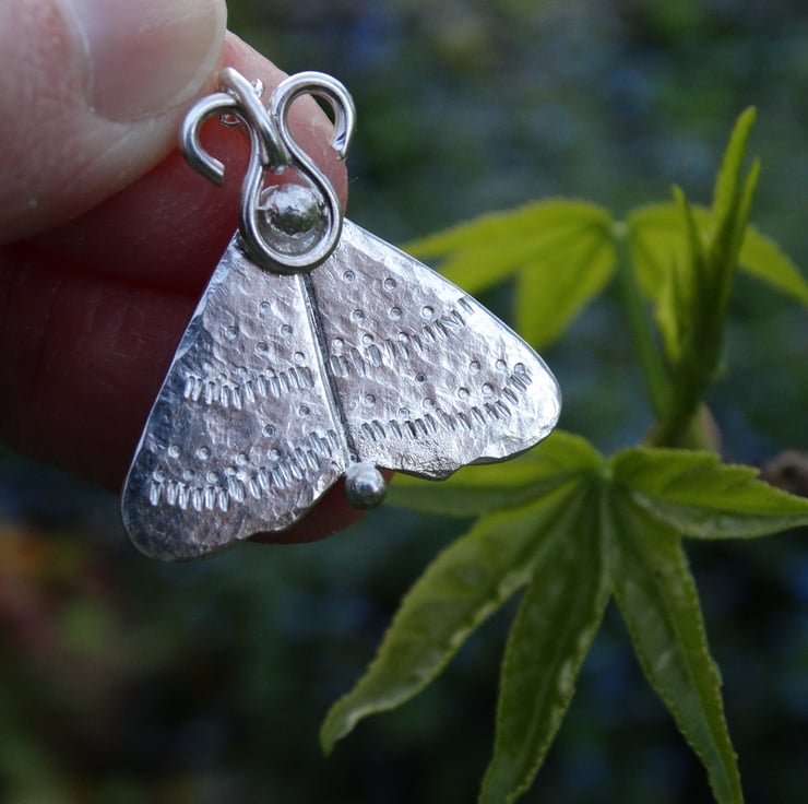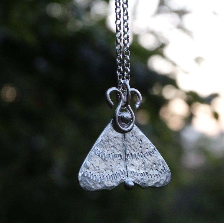 I began making moths in silver inspired by the Scarlet Tiger moths that appear in our garden around the time of the summer solstice each year. I loved making these “midsummer moths”, and they proved popular, so imagine my delight when I found out some species of moth are active during the winter months! This particular design is inspired by the Winter Moth, and I make others inspired by the December Moth.