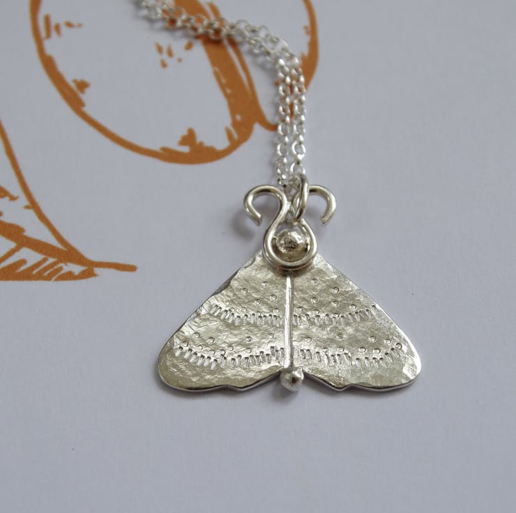 Each of my moths is drawn by hand before being cut out from Eco Silver sheet using a jeweller's saw. The silver is textured all over using a hammer, and I solder on the little embellishments which are made from Eco Silver wire and melted scrap silver. Further details are added by hammering, punching and engraving by hand.