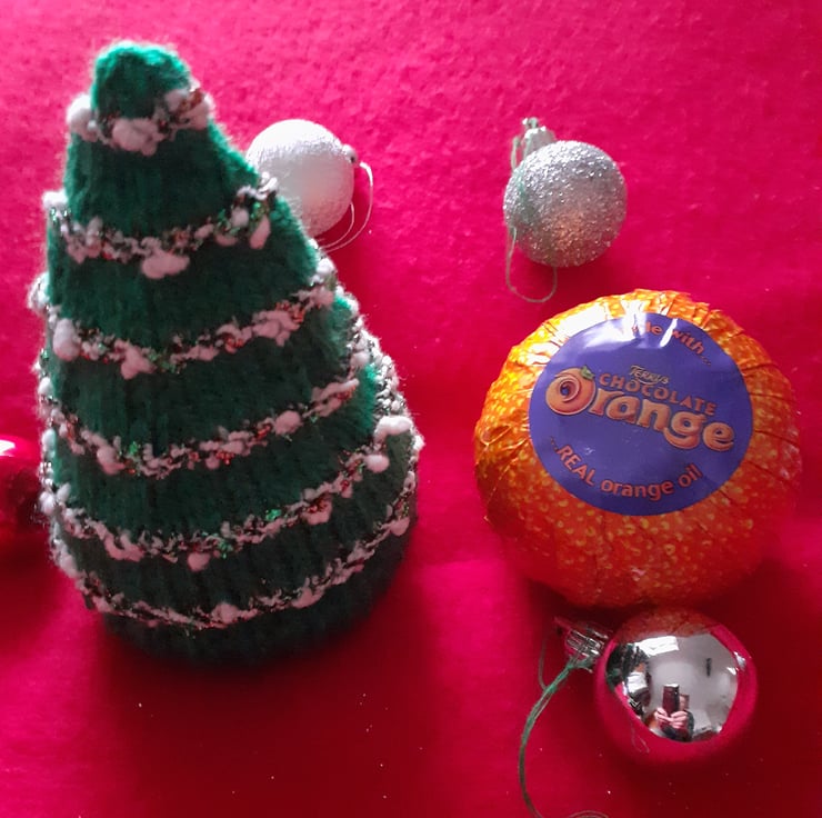 A hand knitted CHRISTMAS TREE Terry's chocolate orange cover.