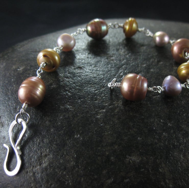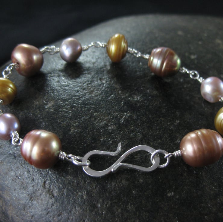 A pretty bracelet made from sterling and fine silver and freshwater pearls. The bracelet is 8"" (20cm) long. It comprises 10 freshwater pearls in different tawny autumn colours. The pearls range from 13mm to 7mm in diameter. The bracelet is finished with a handmade silver S clasp.