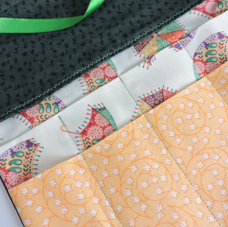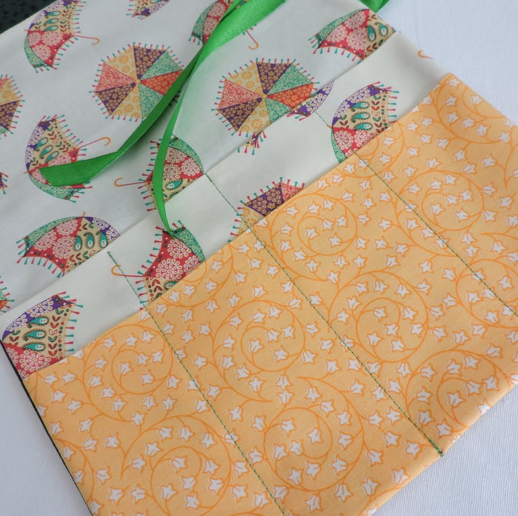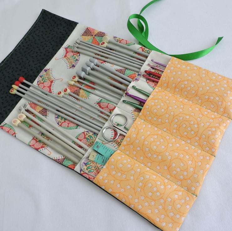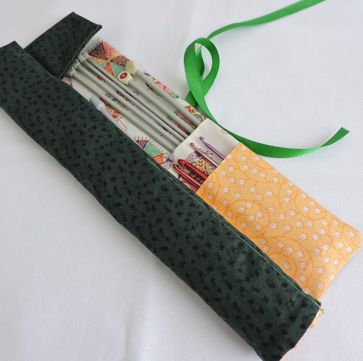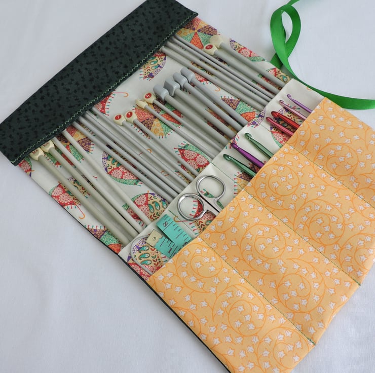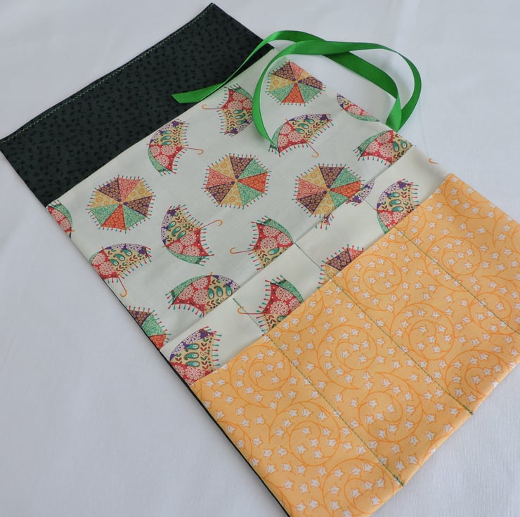 Sale now £7.00 A handy knitting needle and crochet hook roll which has been made with assorted cotton fabrics. Outer fabric of the roll is a dark green with tiny black leaves, the inner fabric has a white background with pretty red, yellow green and blue umbrellas. There are two layers of cotton fabric pockets with four divisions in each layer one in the same fabric as the inner of the roll, and the other is a yellow fabric with little white flowers. The divisions are large enough to hold a number of needles, crochet hooks, scissors, tape measures etc.