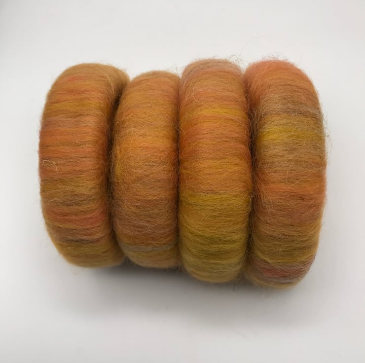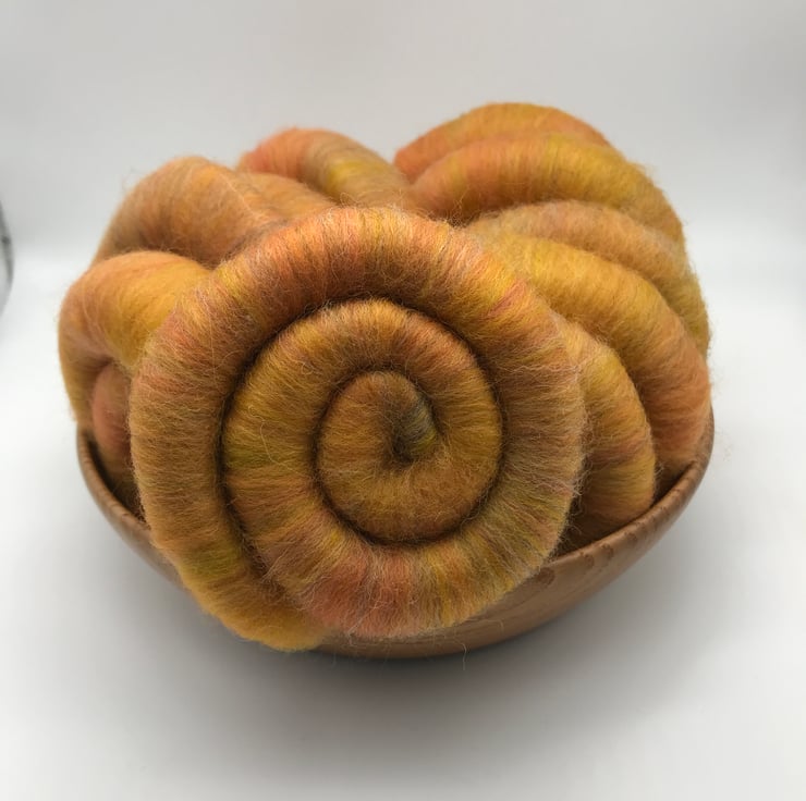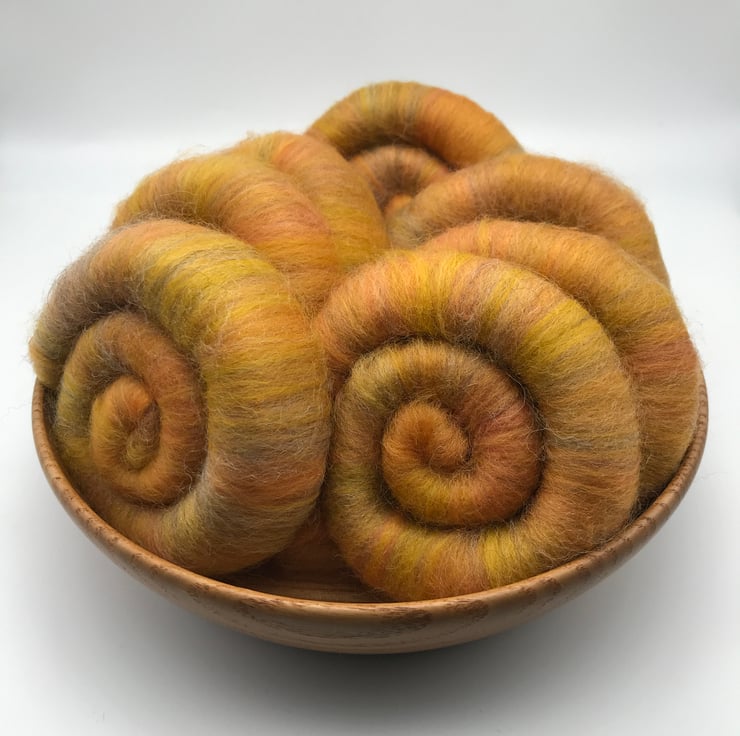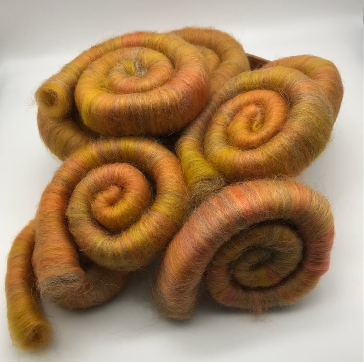 These hand blended rolags are ideal for spinning your own yarn. They are made up of 75% dyed Merino & 25% oatmeal Bluefaced Leicester hand blended rolags.