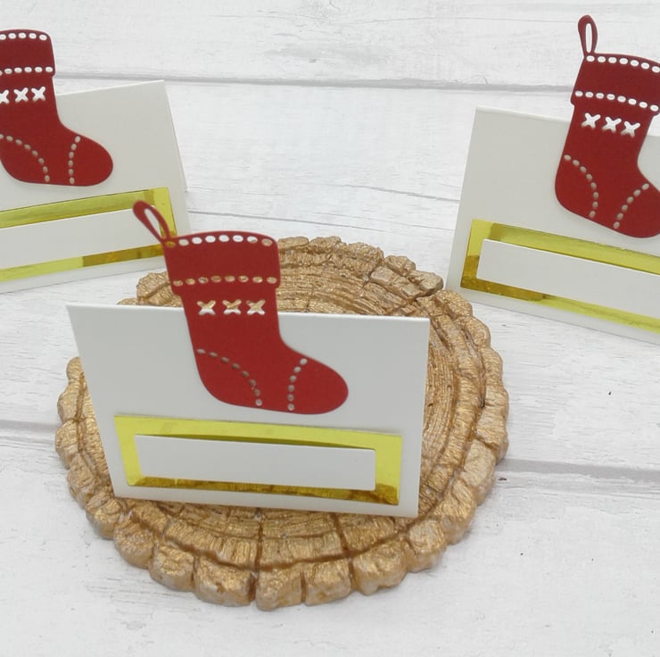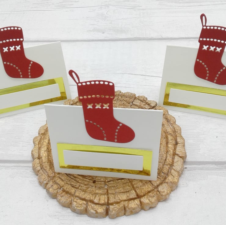 This is a set of 10 ivory place cards with gold and ivory name space decorated with red Christmas stocking.