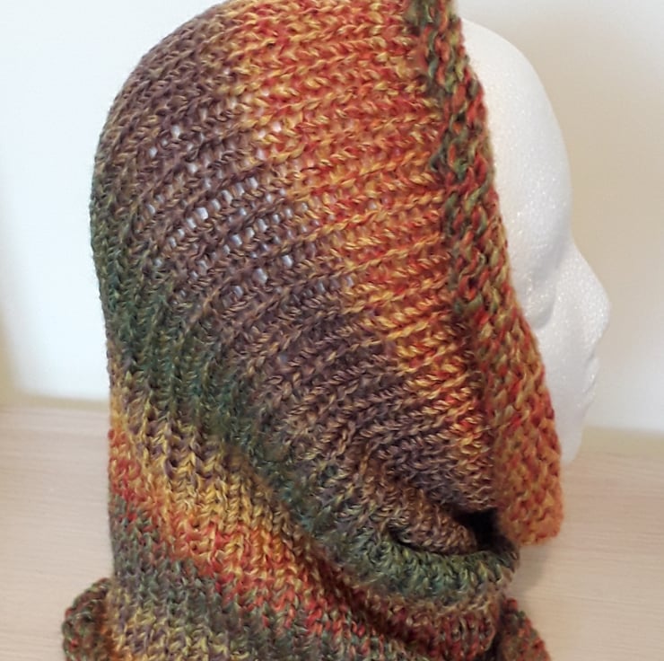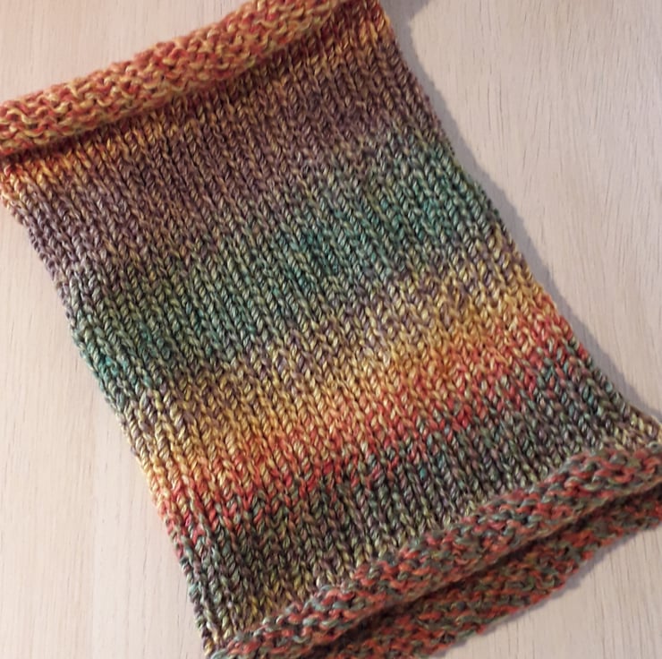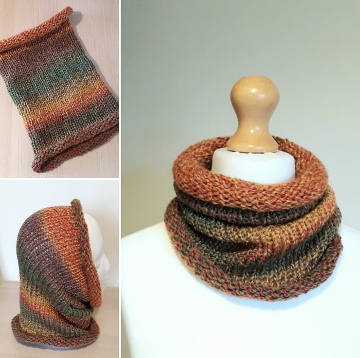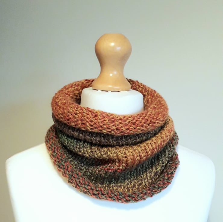 This beautiful cowl has been knitted from soft, chunky acrylic yarn.
