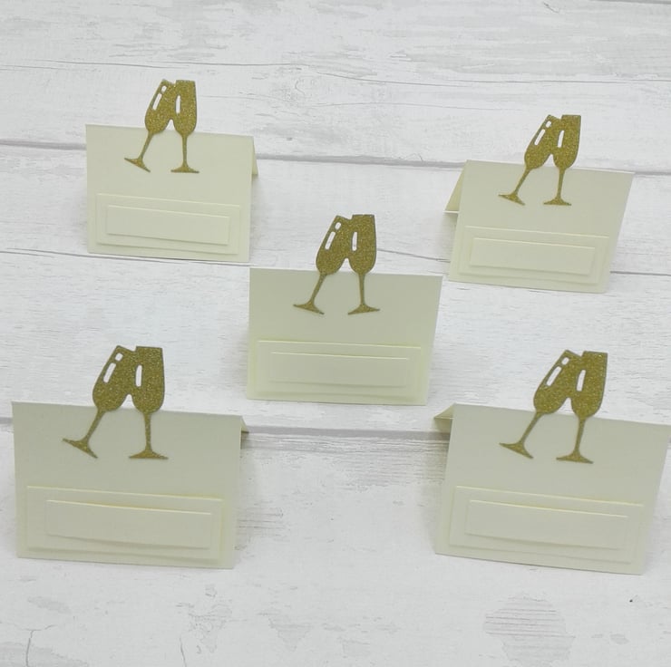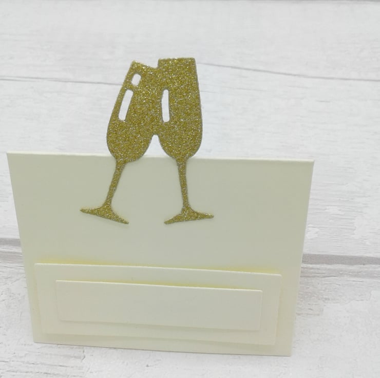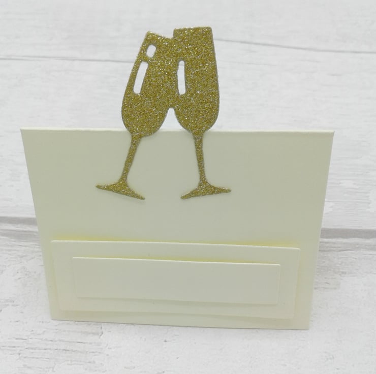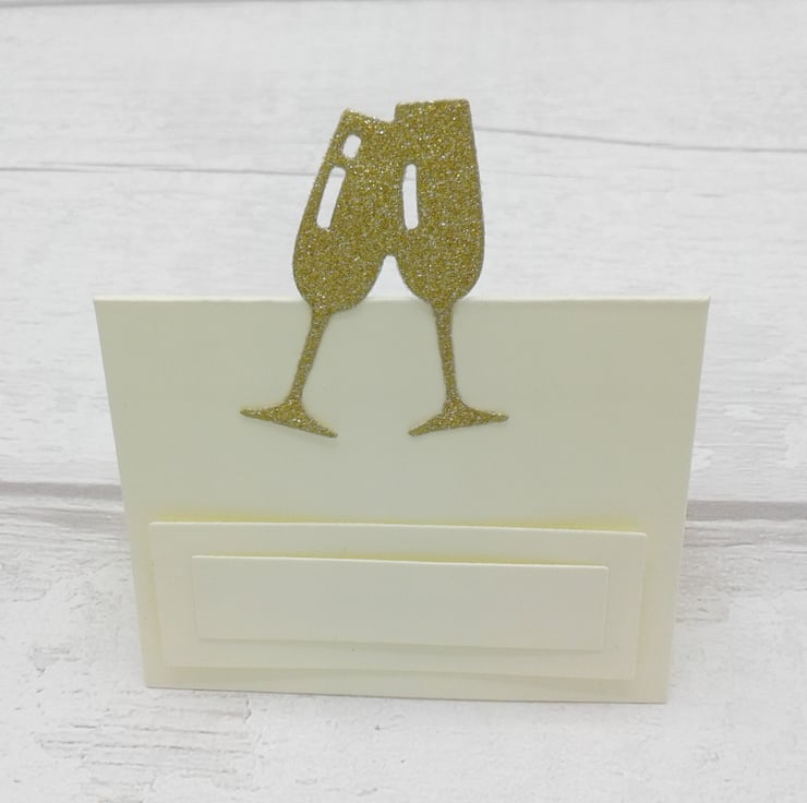 This is a set of 10 ivory place cards decorated with gold glitter champagne glasses.
