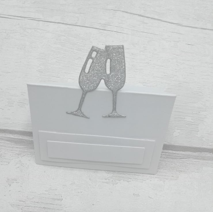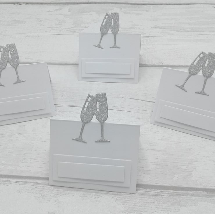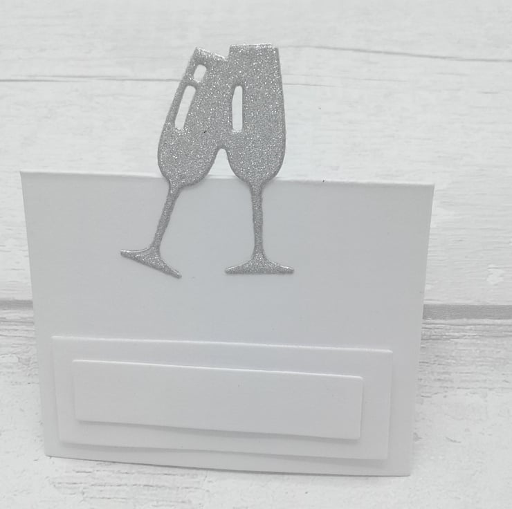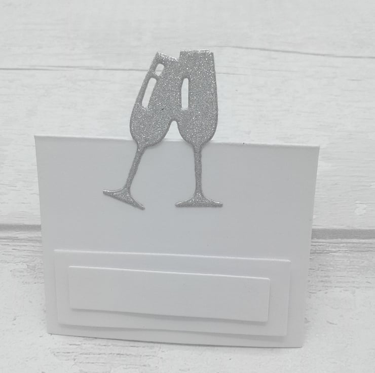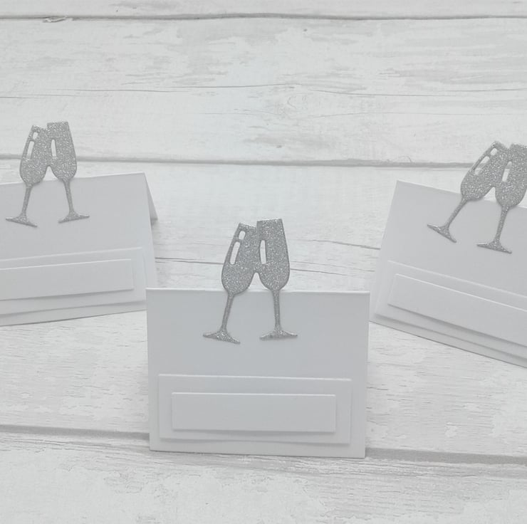 This is a set of 10 white place cards decorated with silver glitter champagne glasses.