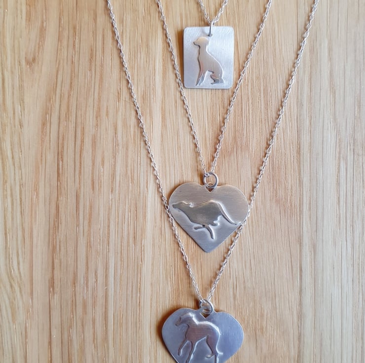 Cute sterling silver whippet necklace made in a small Sheffield studio. The whippet has been hand pierced from a 0.5mm piece of silver and then soldered onto another 0.5mm piece. The whippet has been polished to show against the satin background.