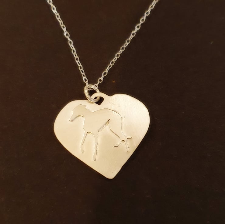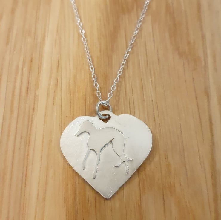 Sterling silver whippet necklace made in a small Sheffield studio. The whippet has been hand pierced from a 0.5mm piece of silver and then soldered onto another 0.5mm piece. The whippet has been polished to show against the satin background.