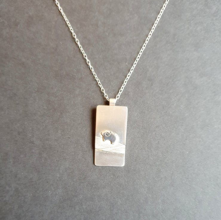 Sterling silver hallmarked sheep on the moors necklace made in a small Sheffield studio. The sheep has been hand pierced and soldered onto the textured moor. It was then hallmarked by deep laser at Sheffield assay office