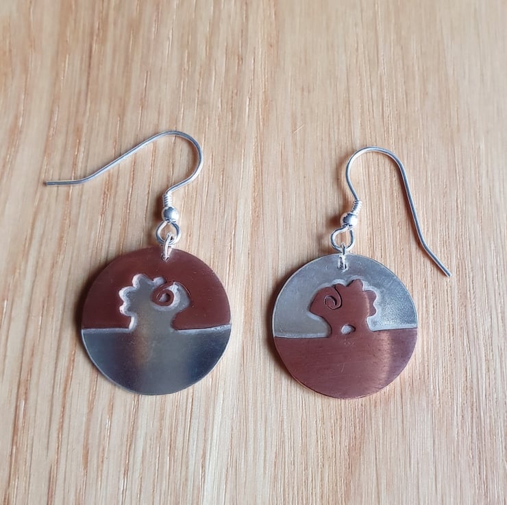 Handcrafted in a small Sheffield studio, these charming earrings feature a pair of mirror-image sheep created from copper and sterling silver. Each sheep has been hand-pierced from a circular copper sheet and soldered onto a sterling silver disc, creating a beautiful contrast between the warm tones of copper and the cool sheen of silver.
