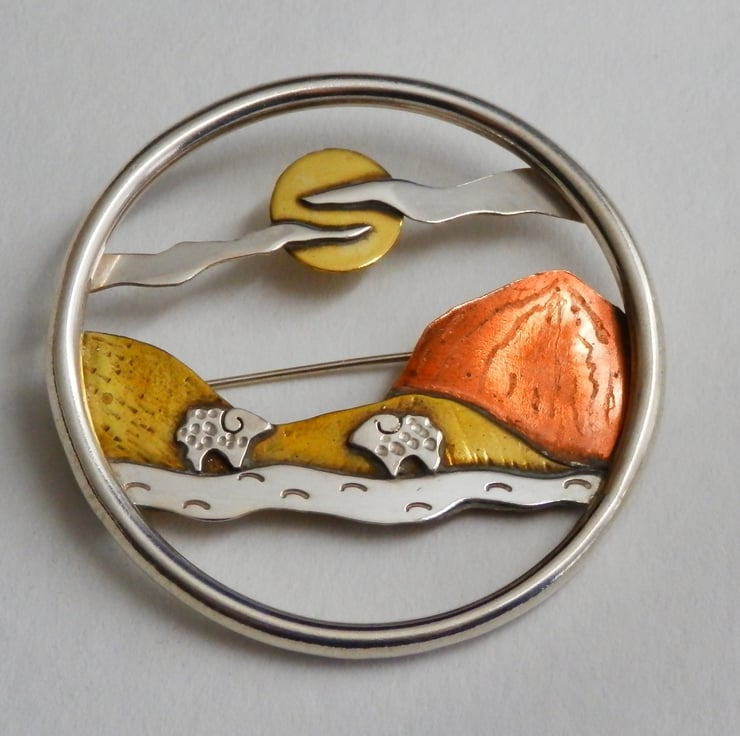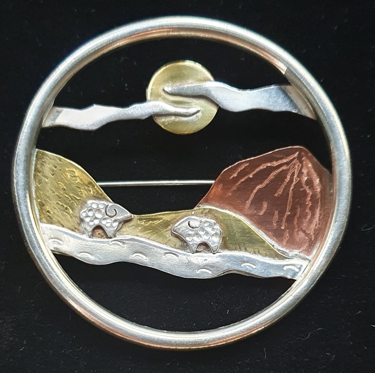 Sterling silver, copper and brass brooch made in a small Sheffield studio. All the elements of this brooch have been hand pierced. The two sheep are made from sterling silver standing on the banks of a river on the copper and brass moors. The sun is also made from brass. All pieces are then soldered onto a handmade 3mm silver hollow circle measuring 5.5cm in diameter. The brooch fittings are also silver. It has been hallmarked by deep laser at Sheffield assay office.