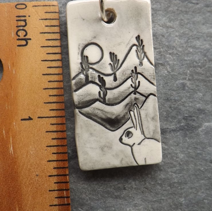 This pendant features a hare, mountains and the full moon. It is painted in black, white and grey. As with all my jewellery it is made and decorated entirely by hand.