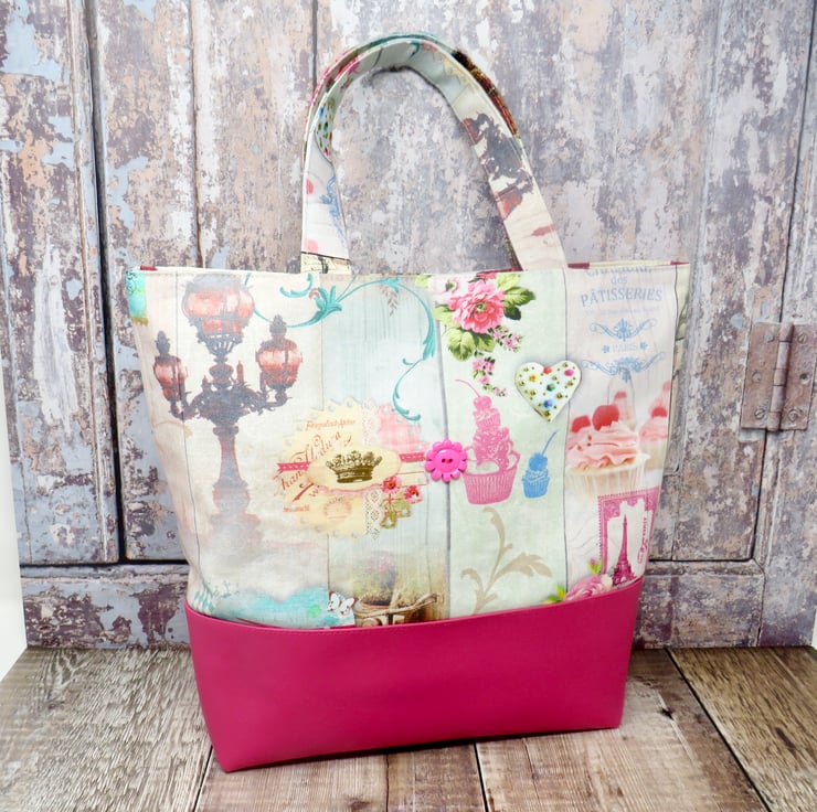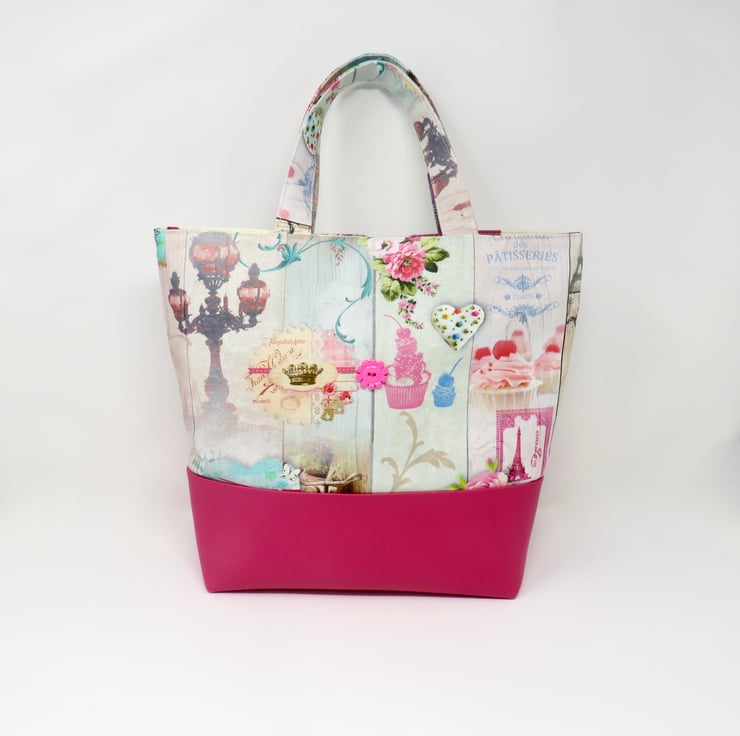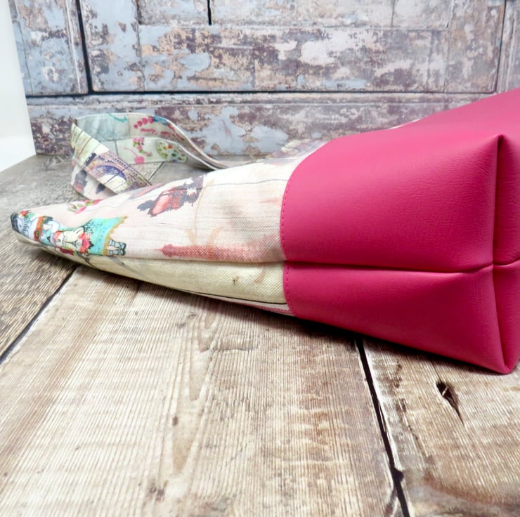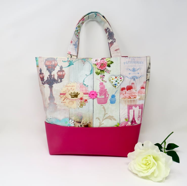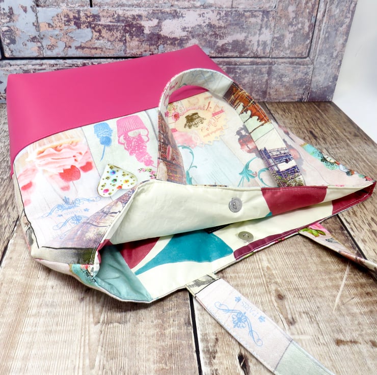 Brighten up a dull day with this fab pink grab bag. Handmade in a Paris themed print and teamed with a bright pink faux leather, it is finished with a fun flower button. The shorter length handles allow for the bag to be carried on the arm or in the hand and it fastens with a magnetic snap. Lined in a silky abstract print it has two internal pockets one of which is zipped.