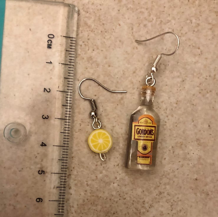 The bottle of Gordons measure approximately 3cm in length, and is paired with a fruity slice of lemon, made from polymer clay.