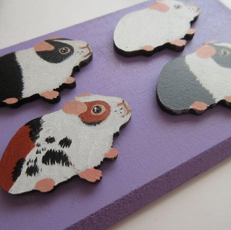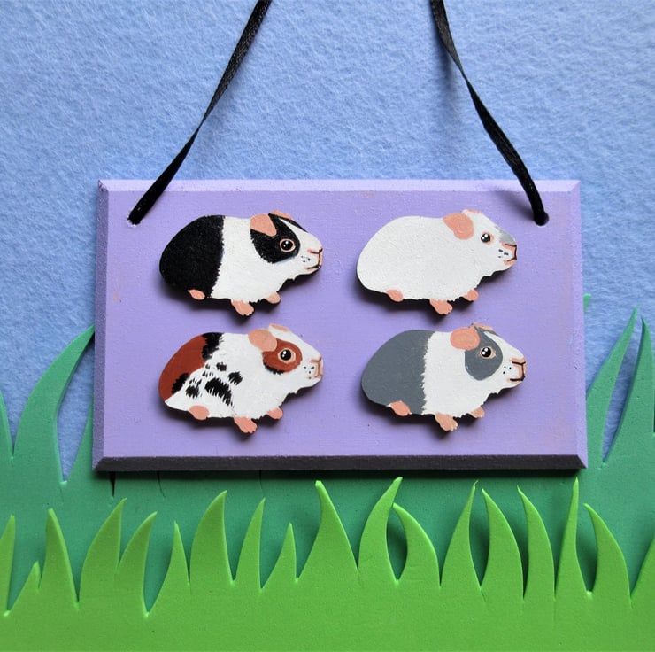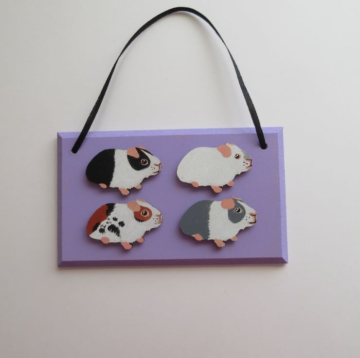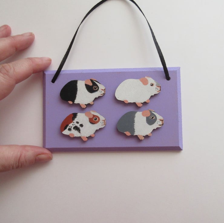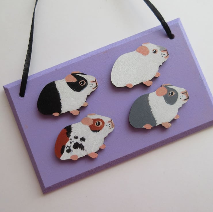A small wooden plaque, embellished with little wooden guinea pigs, hand painted in different colourways. Each little guinea pig has been painted by hand.