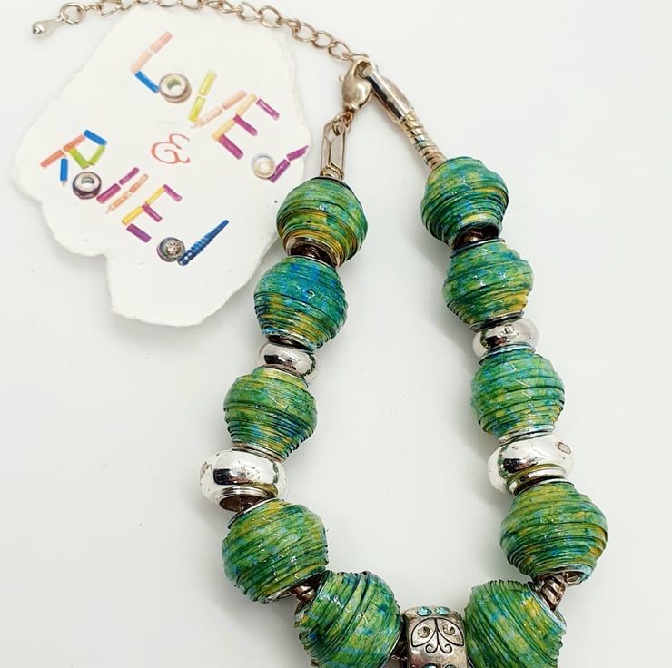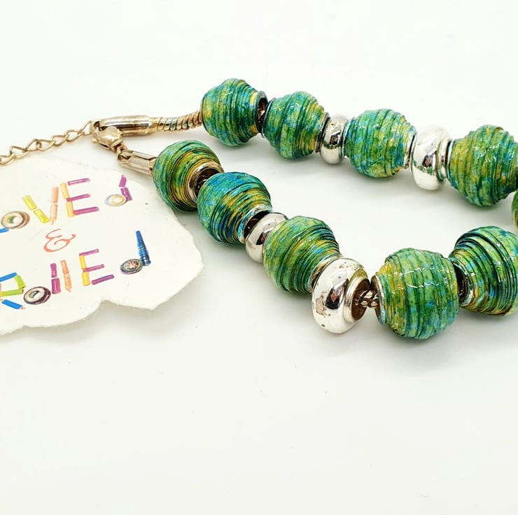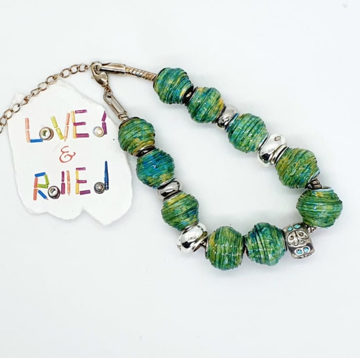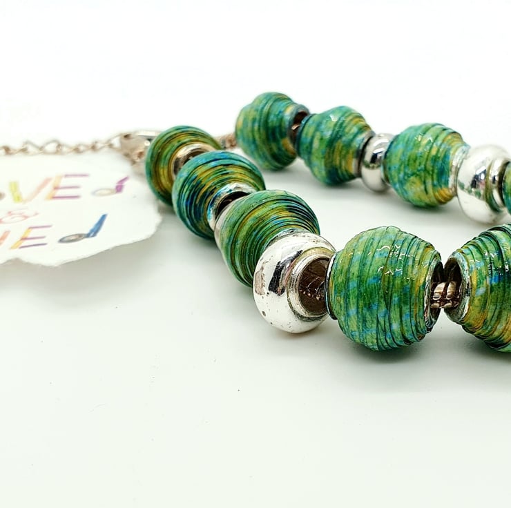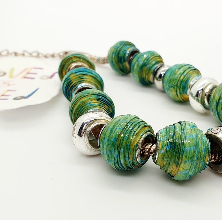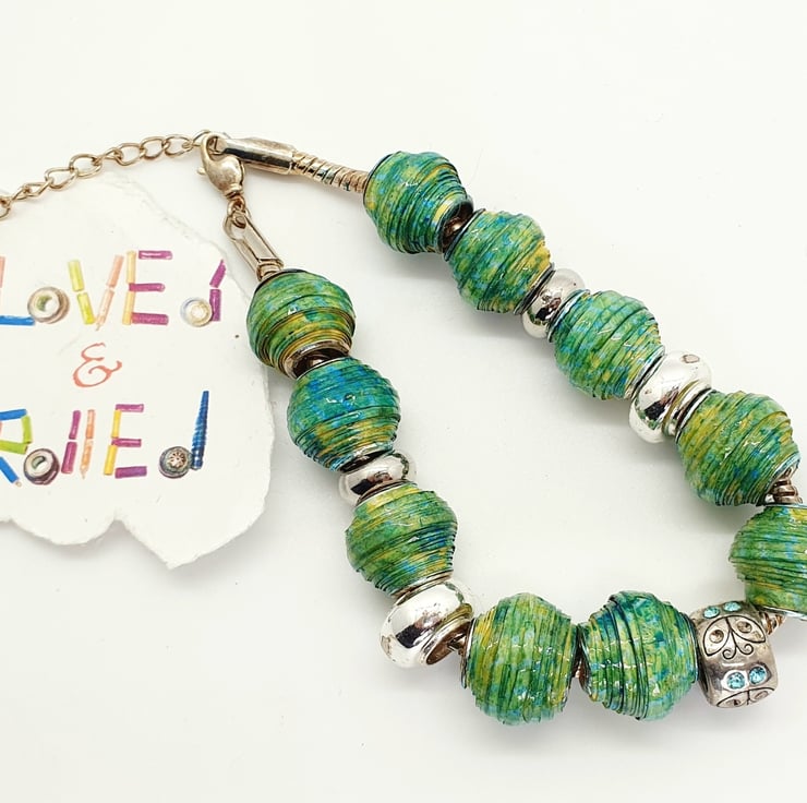 An unusual and eye-catching European style paper beaded bracelet. Made with recycled yellow wrapping paper which was cut into strips and handrolled into european style round beads with cored ends. The beads were then handpainted with a blue paint, giving a lovely blue green finish and then varnished. Threaded on a metal chain and complemented with pre-loved silvery beads and a carved central metal bead encrusted with sparkling blue and green glass